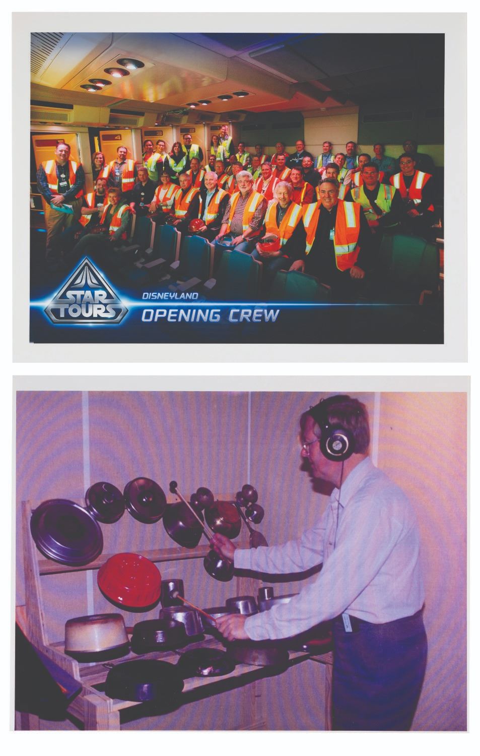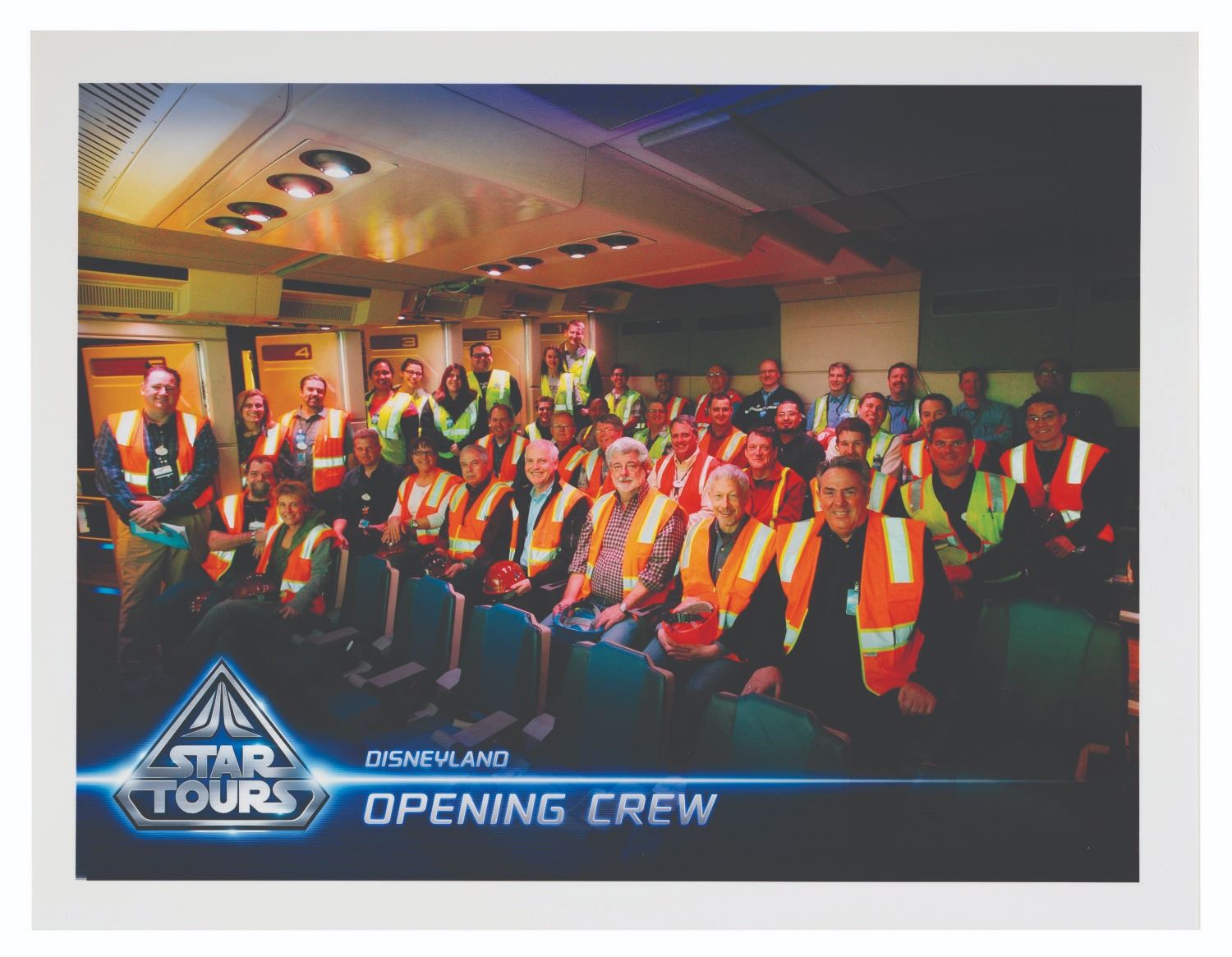 (Disneyland, 2011) A Star Tours: The Adventures Continue Disneyland opening crew photo featuring “Star Wars” creator, George Lucas. Measuring 8.5” x 11”, the photo is in very good condition with light scratches, wear, and stains on the left border.