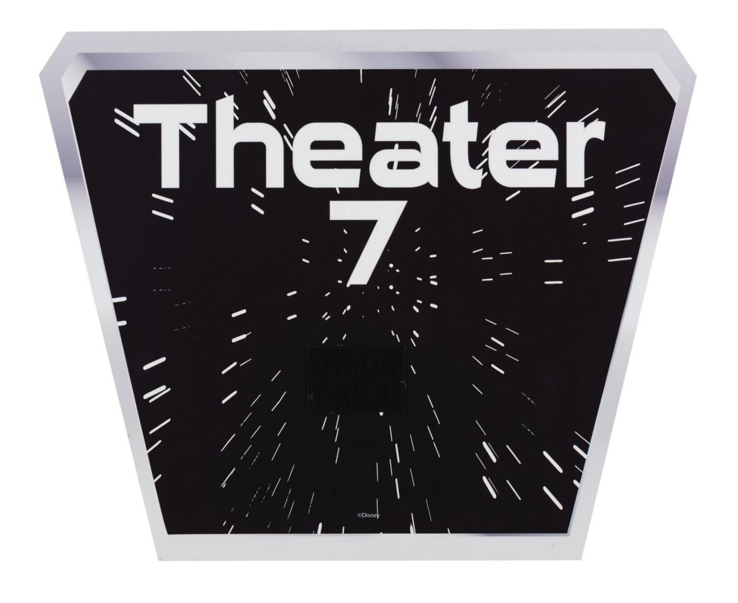 (Disneyland, c.2010s) A "Theater 7" sign, likely produced for a Star Tours themed show or event at Disneyland Resort. Measuring approximately 16"x20", the sign featuring a starfield at hyperspace is in fine condition while exhibiting minor surface wear.