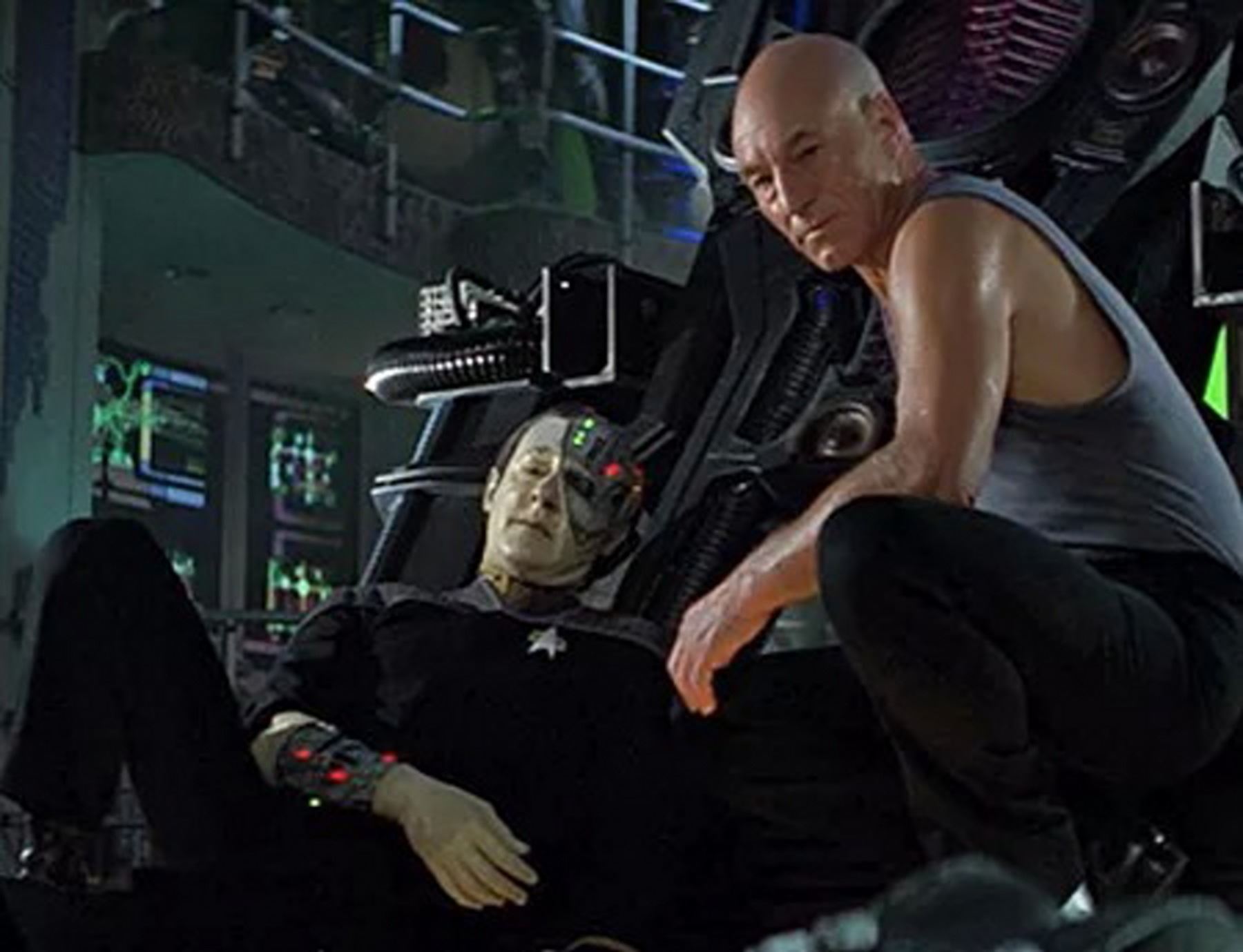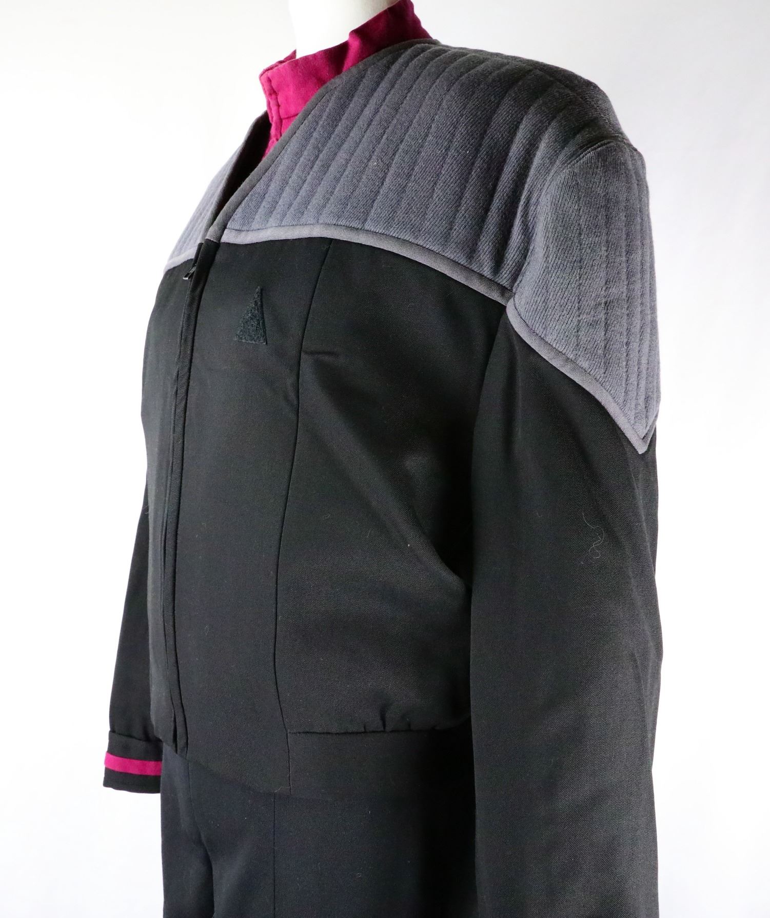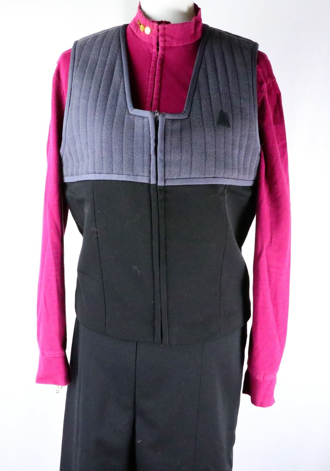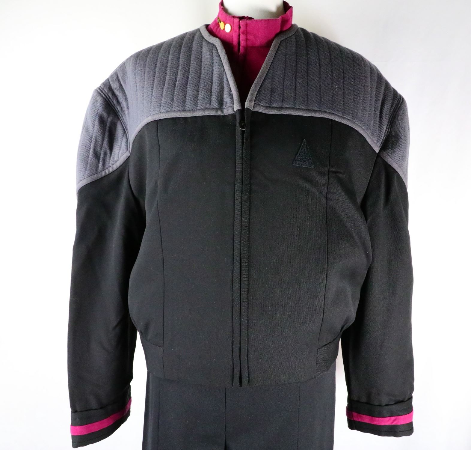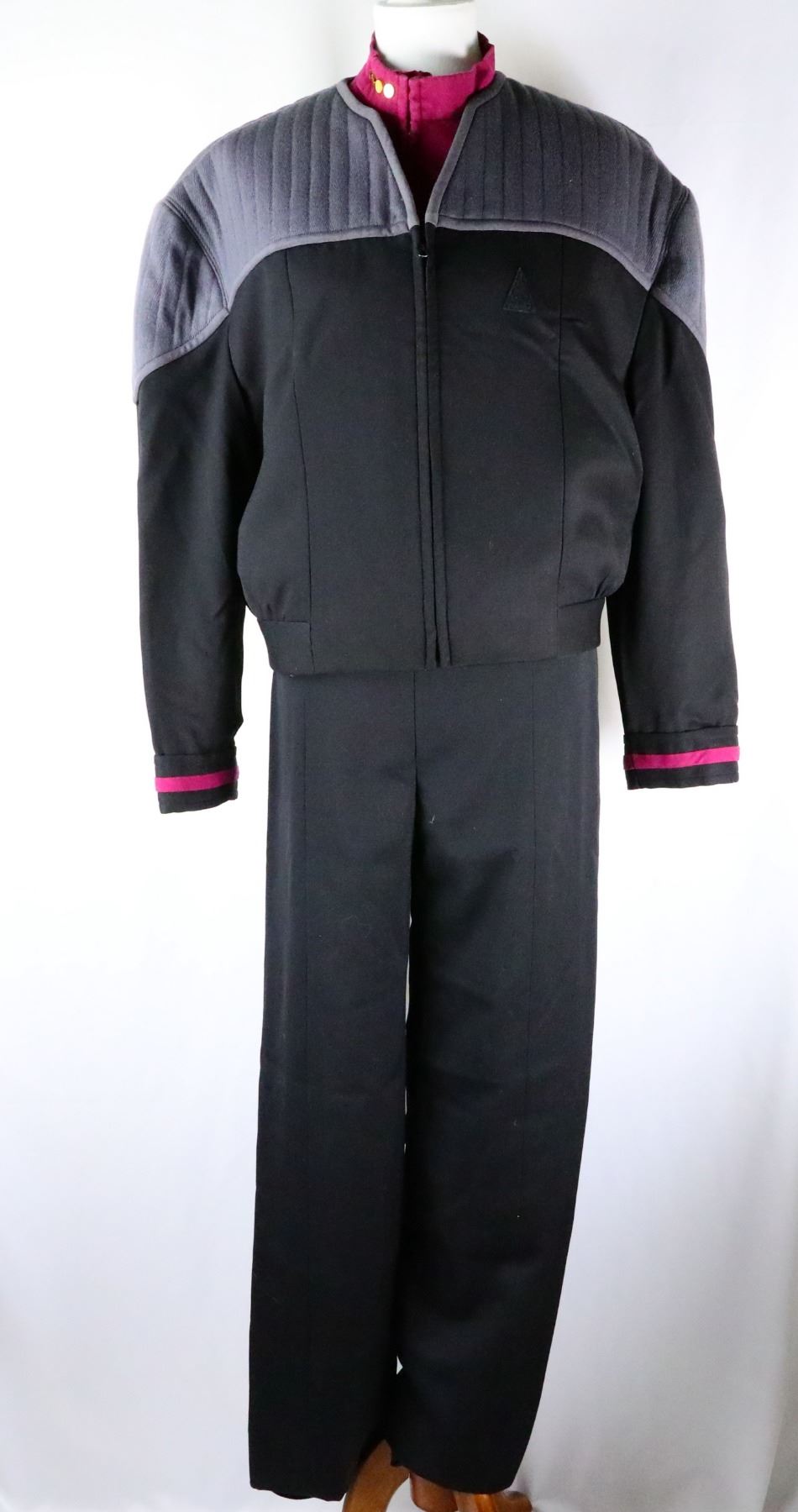Star Trek: First Contact (1996) Patrick Stewart's (Captain Picard) Complete Starfleet Uniform W/COA - This Starfleet uniform was used by Patrick Stewart as he portrayed "Captain Jean-Luc Picard" in the 1996 American science fiction film Star Trek: First Contact, based on the franchise of the same name. The film was the eighth in the franchise, and grossed $30.7 million its first week making it the top movie at the US box office. The film went on to gross $77 million in its first four weeks, and was the best-performing Star Trek film in international markets until 2009's film. This Starfleet uniform was custom made by Emmy winning costume designer Robert Blackman, who was a long time costumer for the series. This costume includes: the instantly recognizable black jacket with gray quilted shoulders and front zipper, velcro attachment for the Starfleet insignia/Communicator and Command red stripe around the cuffs; Starfleet vest with gray quilted shoulders, front zipper and velcro attachment for the Starfleet insignia/Communicator; grey sleeveless shirt which is instantly recognizable from the pivotal film finale; tunic shirt with four pips denoting the Captain's rank, center zipper and sewn in tag which reads "PICARD"; black trousers with sewn in "away team" gear loops on the waist and inner label which reads "Steve Kelso 1-02 'Picard' stunt" (according to our seller who obtained the information from a Star Trek expert, these pants were worn by both the stuntman and Patrick Stewart); and black Starfleet boots. The costume displays some wear from use, and is in very good screen used condition. This is truly an iconic piece of science fiction memorabilia in this complete, screen used condition. This ensemble will be accompanied by a certificate of authenticity. The costume's designer Robert Blackman received 10 Emmy nominations for his work on Star Trek, winning twice for Next Generation episodes. He also won an Emmy in 2009 for his work on the Pushing Daisies episode "Bzzzzzzzzz!", and in 2006 he was awarded with a Career Achievement Award from the Costume Designers Guild, along with their Spotlight Award. VIEW MORE PICTURES