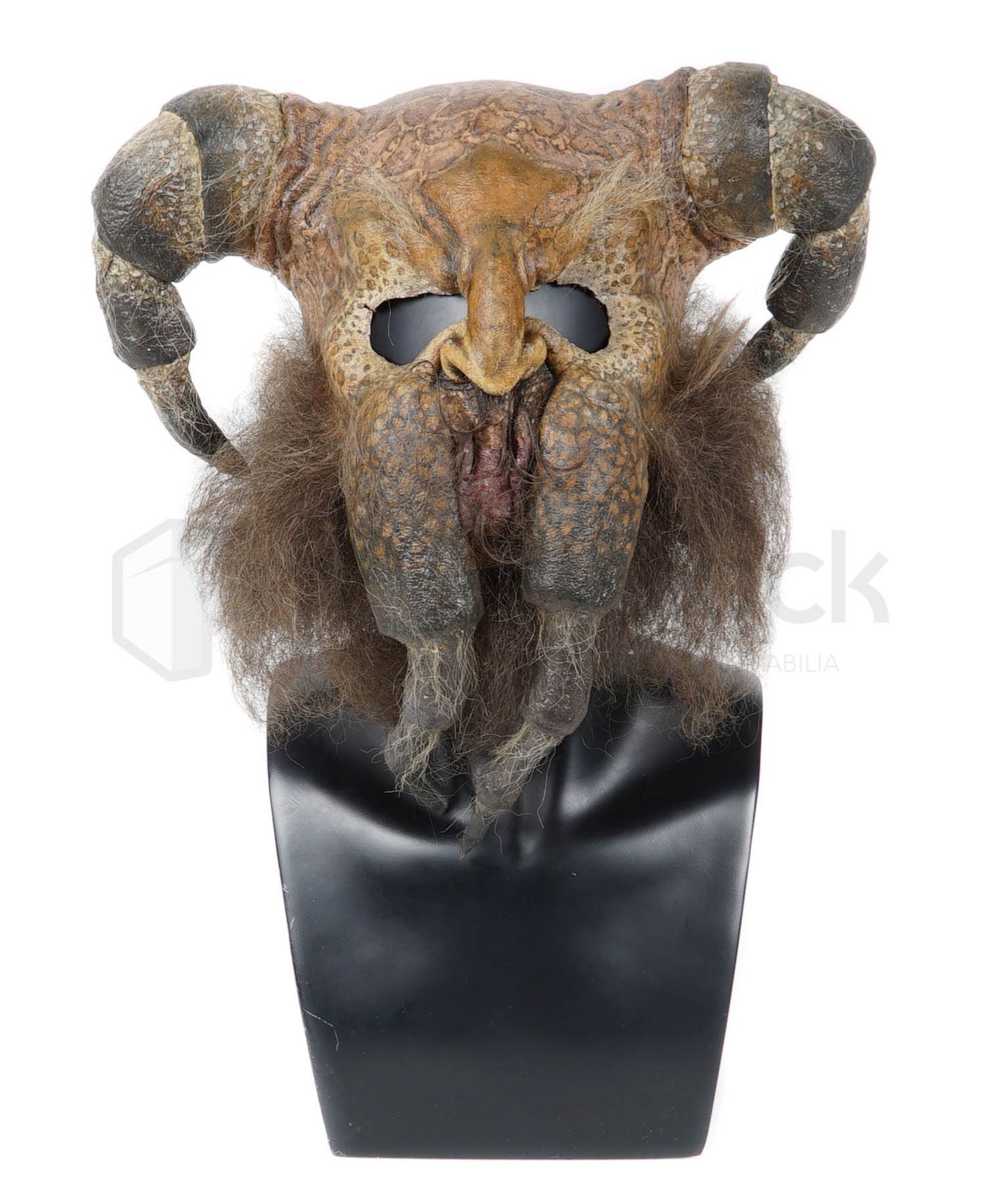 Alien head slip mask featured in the production of the 2009 JJ Abrams rebooted film Star Trek. The brash James T. Kirk tries to live up to his father's legacy with Mr. Spock keeping him in check as a vengeful Romulan from the future creates black holes to destroy the Federation one planet at a time. This alien can be seen in the bar scene in the film where it was featured in the background. The mask is mad of foam latex on a skull cap made of fiberglass. The head features spider-like arms on the side and front and is painted brown with hand punched hair. This piece remains in excellent, production used condition.