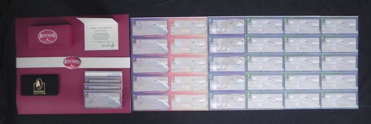 This is a complete set of Star Trek checks and uncut sheets from the Anthony Gradio First 100 Series produced in 1996. They are in mint condition, and checks come in the original box. The four different designs feature original Star Trek and Voyager images through the first 30 years. Also included is a "Captain's Log" sure to inspire you to balance your checkbook. The most interesting part of this set are the four uncut sheets, each with 15 checks, from all four designs. This is a fantastic set of Star Trek Checks, and the uncut sheets are a great bonus.