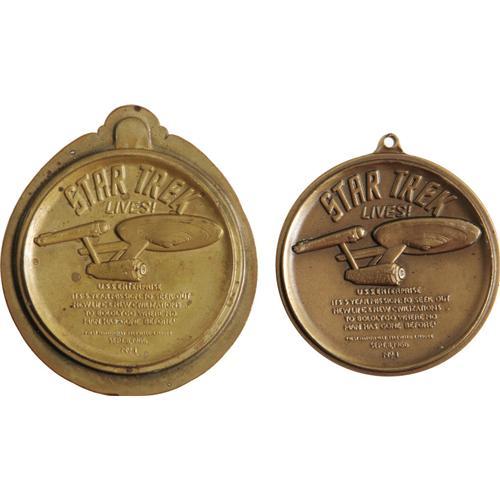<B>Rare "Star Trek" Bronze Medallion Prototypes.</B></I> A pair of rare prototypes for a medallion commemorating the television debut of the original <I>Star Trek</B></I> series. Captain Kirk and Mr. Spock are featured on the obverse, with an image of the starship <I>Enterprise,</B></I> "Star Trek Lives!", and the crew's mission statement stamped on the reverse. Both are in Excellent condition, with some untrimmed flash around the edges of one.<BR><BR><b>Shipping:</b> Flat Material, Small (<a target="_blank" href="http://www.heritageauctions.com/common/shipping.php">view shipping information</a>)
