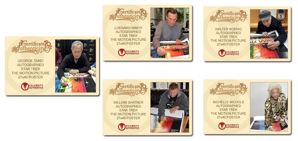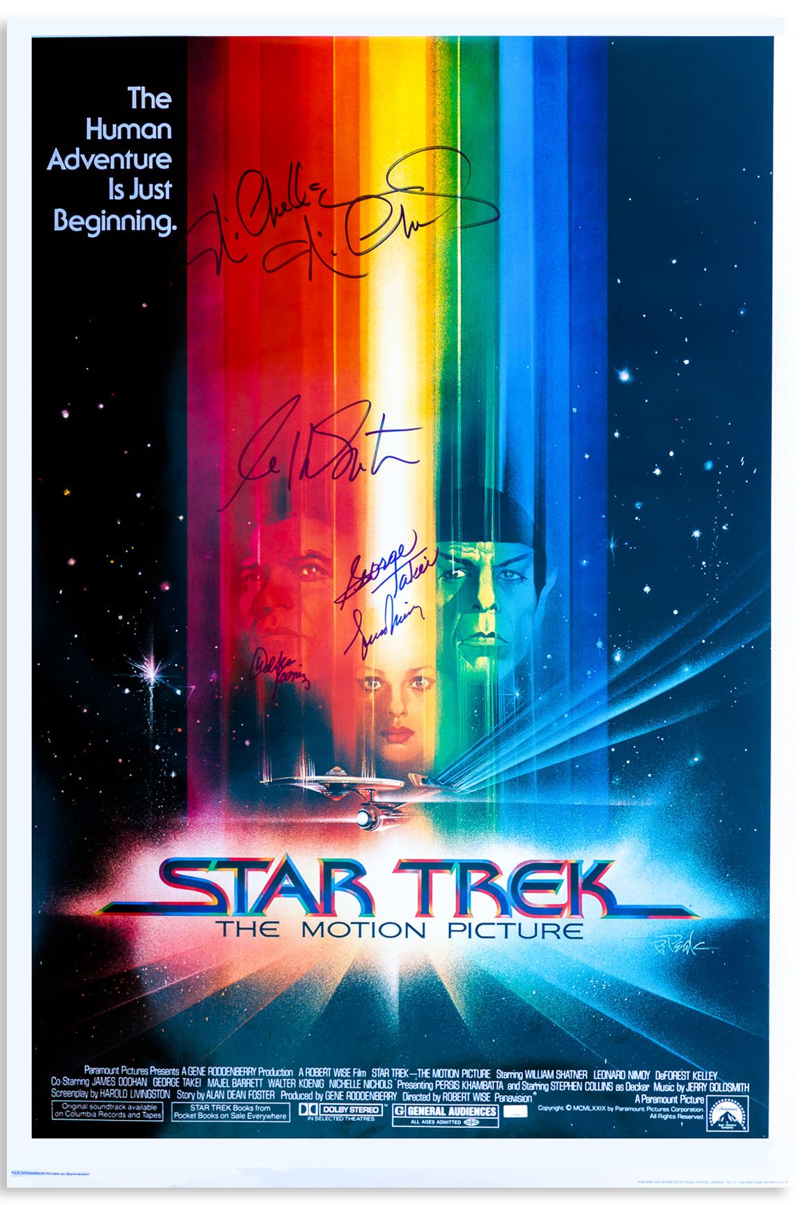 Cast-signed poster for ''Star Trek: The Motion Picture'', the 1979 film that started the franchise. Signed boldly in blue felt-tip by five of the principal actors, William Shatner, Leonard Nimoy, Nichelle Nichols, George Takei, and Walt Koenig. Poster measures 27'' x 40'', in flawless, near fine condition. With COAs from Celebrity Authentics for each signature.