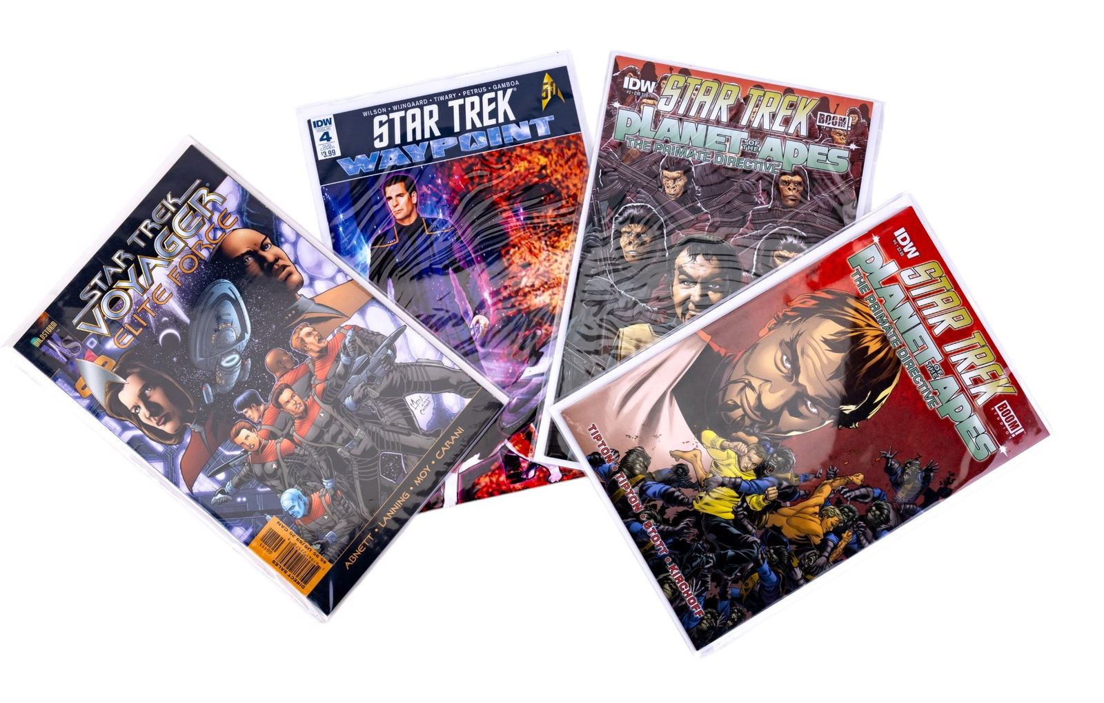 A collection of 37 Star Trek comic books featuring series such as Green Lantern crssove, Planet of the Apes crossover, New visions, Waypoint, Boldly Go, Manifest Destiny, and more, published by Wildstorm, IDW, and DC Comics.