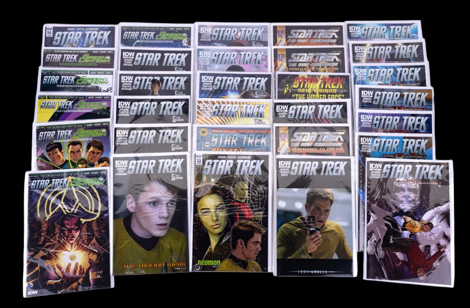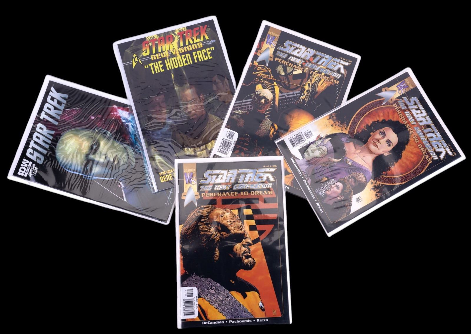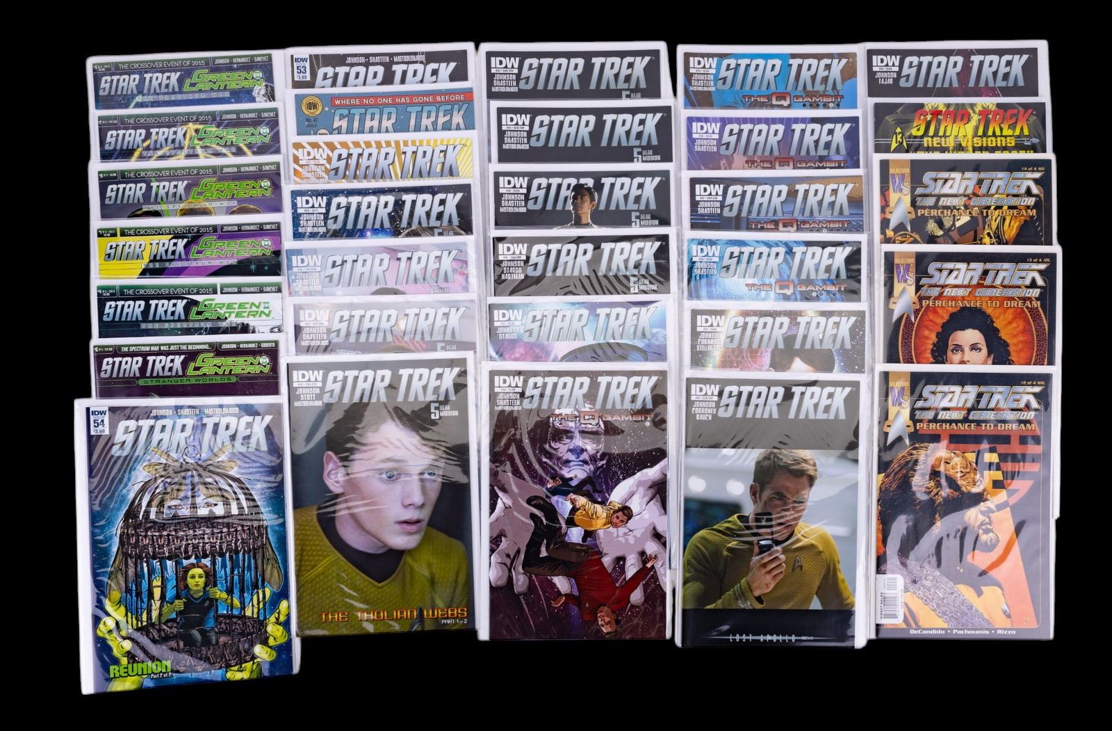 A collection of 31 Star Trek comic books featuring series such as Green LAntern crossover, Next Generation: Perchance to Dream, The Q Gamit, Live Evil, and more, published by Wildstorm, IDW, and DC Comics.