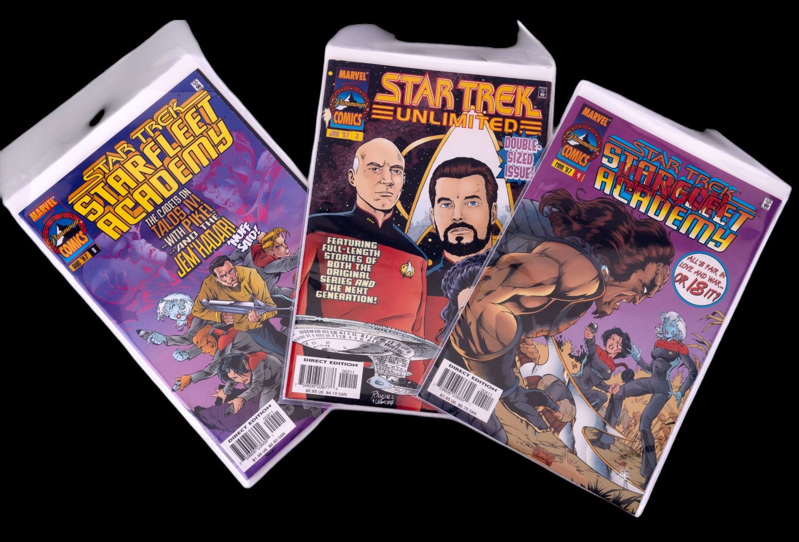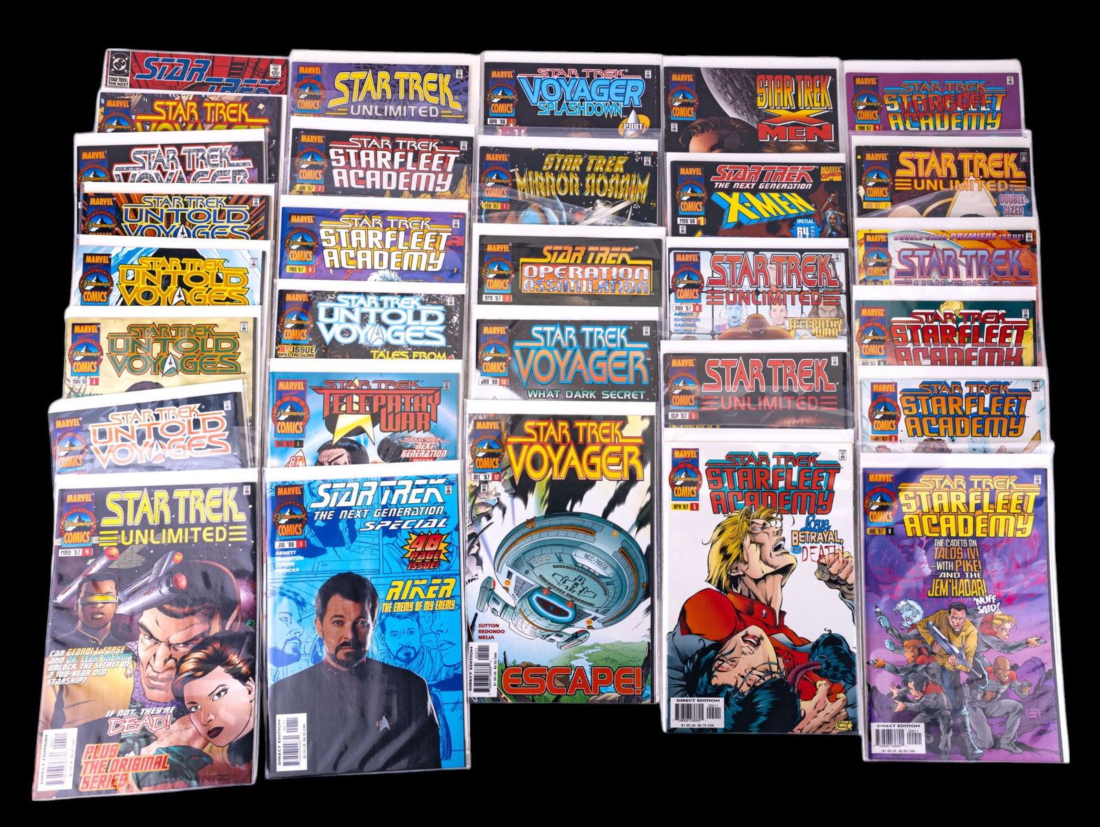 A collection of 30 Star Trek comic books featuring series such as X-Men crossover, Voyager, Untold Voyages, Unlimited, Starfleet Academy, and more, published by Marvel and DC Comics.