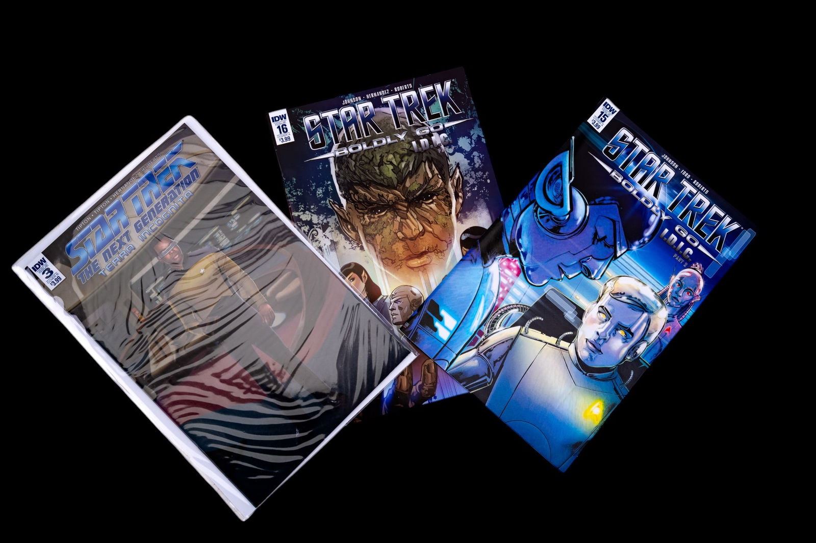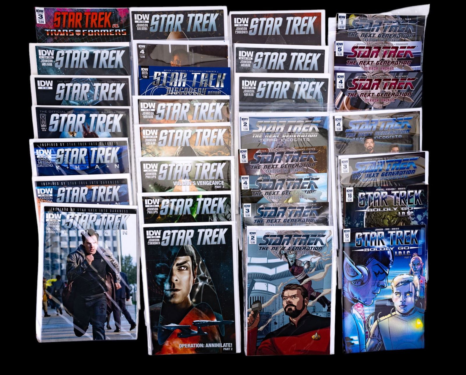 A collection of 30 Star Trek comic books featuring series such as Transformers crossover, Operation: Annihilate, Stark Trek Offical Film adaptation, Khan (Into Darkness movie), Discovery, Next Generation, and more, published by IDW.