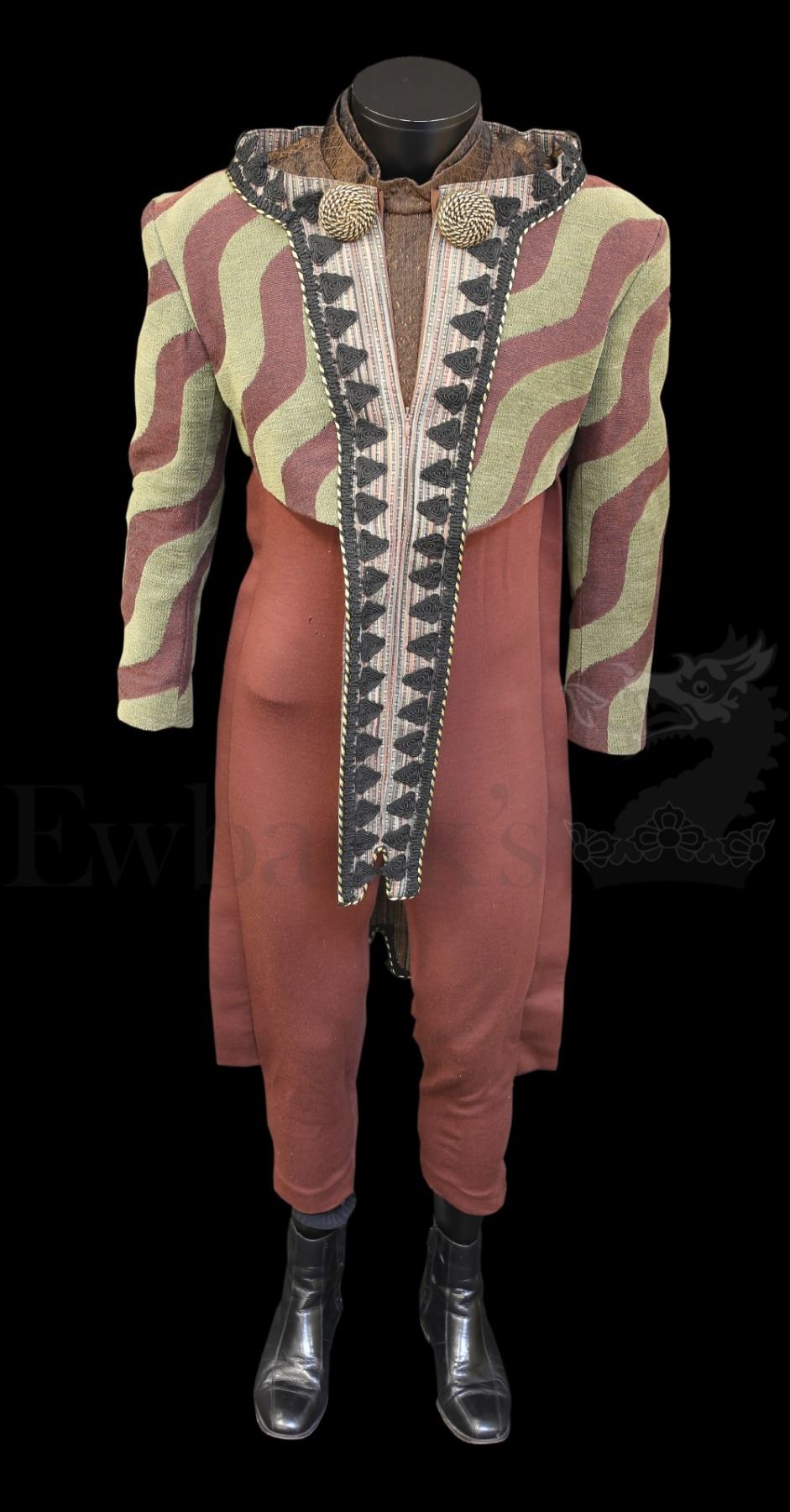 † Star Trek Deep Space Nine (1993) 'Nava' (Barry Gordon) Ferengi Costume from the episode 'The Nagus'. Comprises of a full-length sleeveless brown jumpsuit with stirrups for the feet, a reflective bronze-colored dickie that attaches to the jumpsuit via Velcro, a long-sleeved jacket in a pattern of olive-green and burgundy wavy lines, a multi-coloured striped portion that goes down the front and around the back and a Ferengi head wrap the colour of the dickie but with the black accents of the jacket. Sewn in tag reads ‘Deep Space Nine, Barry Gordon' and a costumer’s tag reads ‘DS9 411, Nava, Barry Gordon’. Please note that VAT is payable on top of the hammer price at 20% in addition to standard buyers premium inc. VAT for this lot.