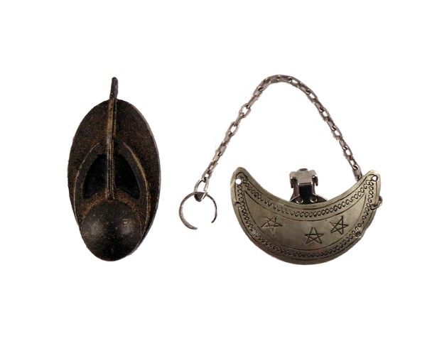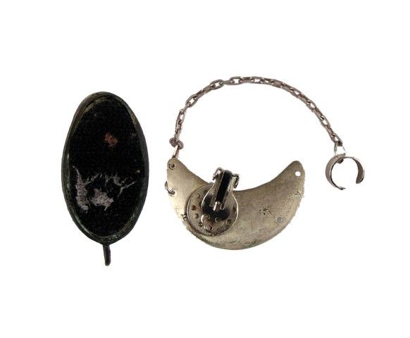 Star Trek Deep Space Nine Bajoran Communication Badge & Nose Ring - In a time when immigration is such a hot topic, it's fascinating to go back to the brilliant hit series "Star Trek: Deep Space Nine", (1993-1999) which used the struggles of the liberated planet of Bajor and its people as a not very subtle metaphor of our own complex immigration controversy. This is a pair of screen used Bajoran props from the series. They include a Bajoran Communicator Badge and a decorative Bajoran Nose Ring. Both come with a Certificate of Authenticity from Movie Ware and the United Movie Collectors Guild. The Badge has the production Velcro backing and the nose ring the nostril clamp, chain and decorative "half-moon" pendent with metal costume clip-on backing. Both pieces are approx 2"x1".