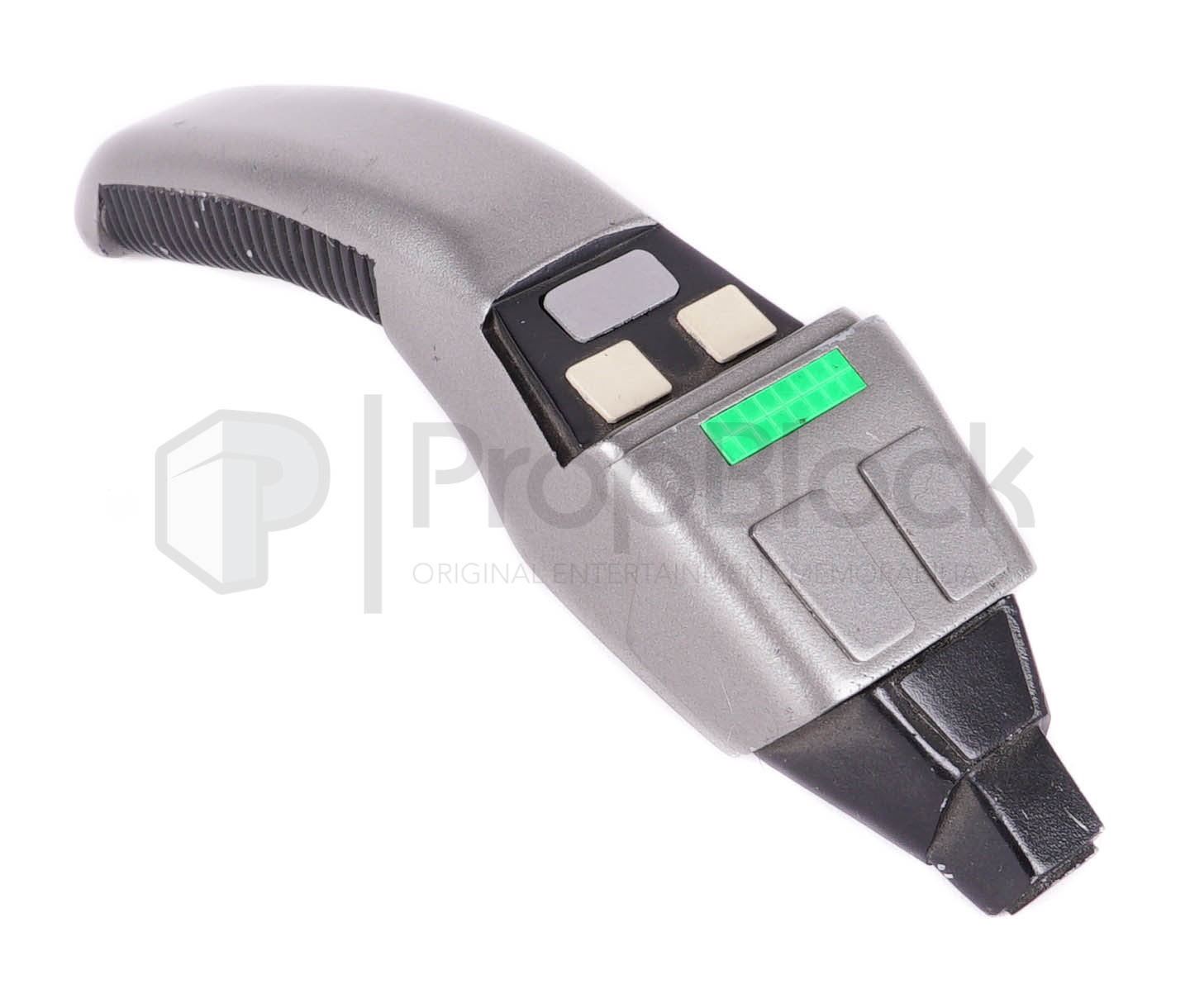 "Boomerang" style Federation phaser used in Star Trek: Deep Space Nine. This type of phaser was an upgrade from the previous "Cobrahead" style phaser which were featured in TNG and the early DS9 seasons. This piece is made of resin, painted silver with a black handle and black emitter tip. The phaser features two power buttons and a depressible trigger button. This piece comes from the collection of the Star Trek prop master Joe Longo and remains in good production used condition.