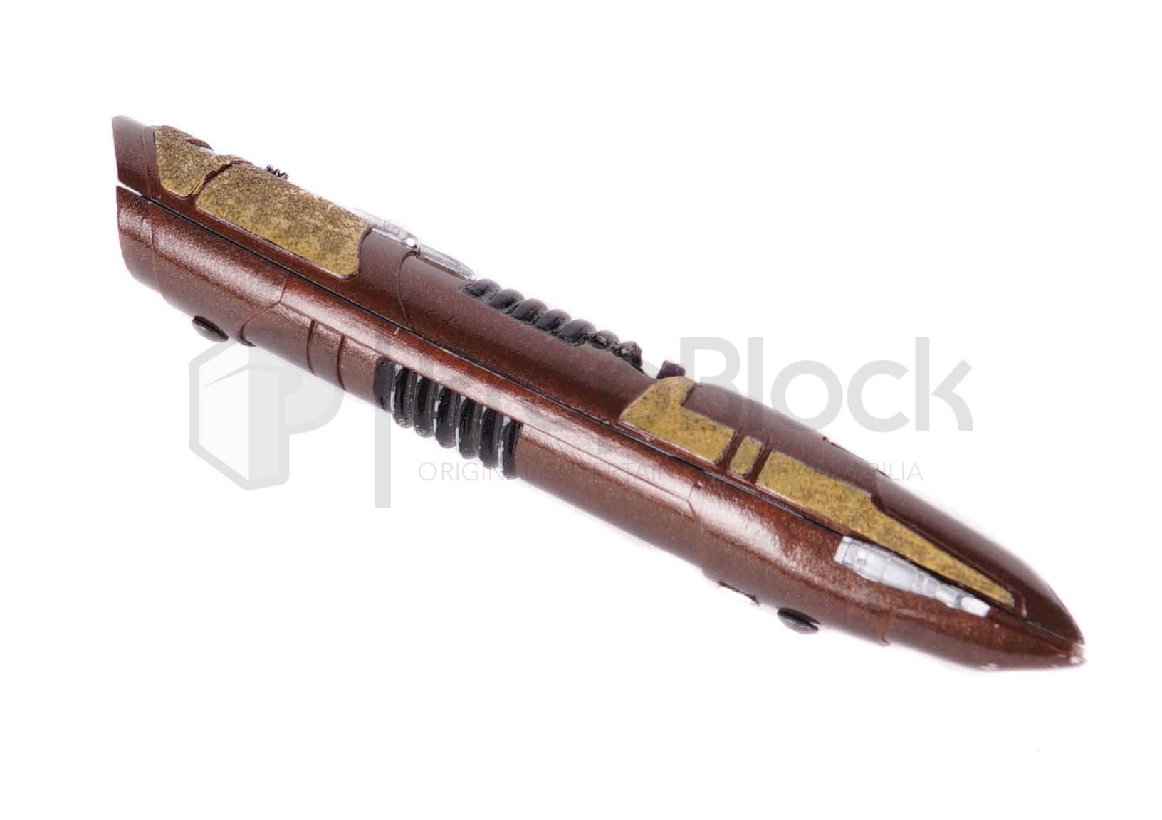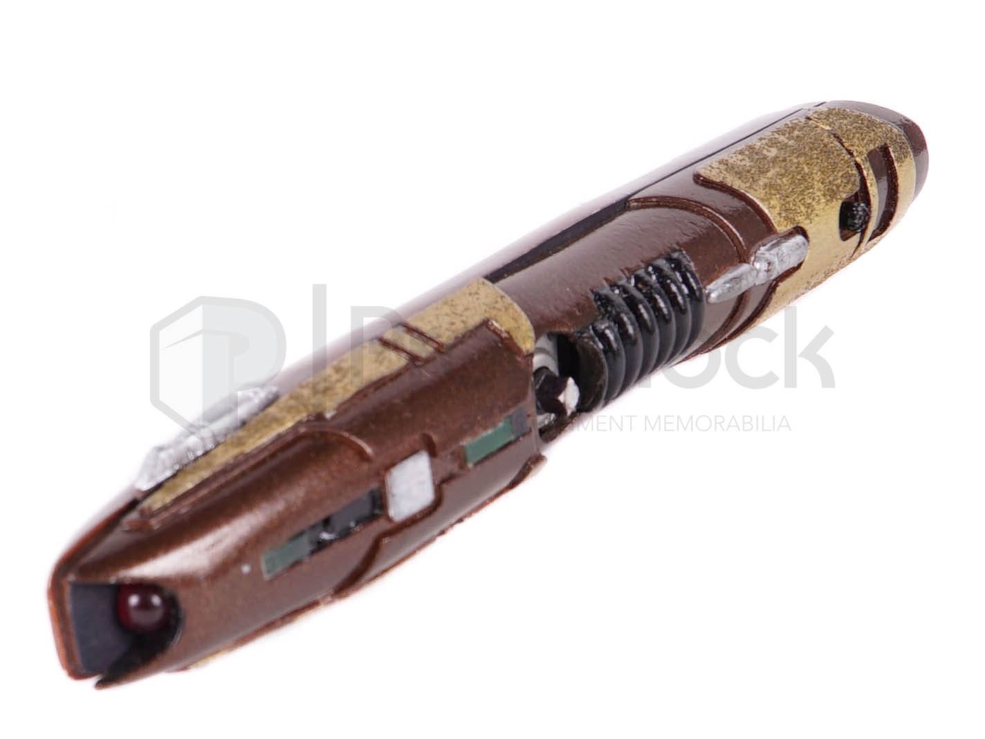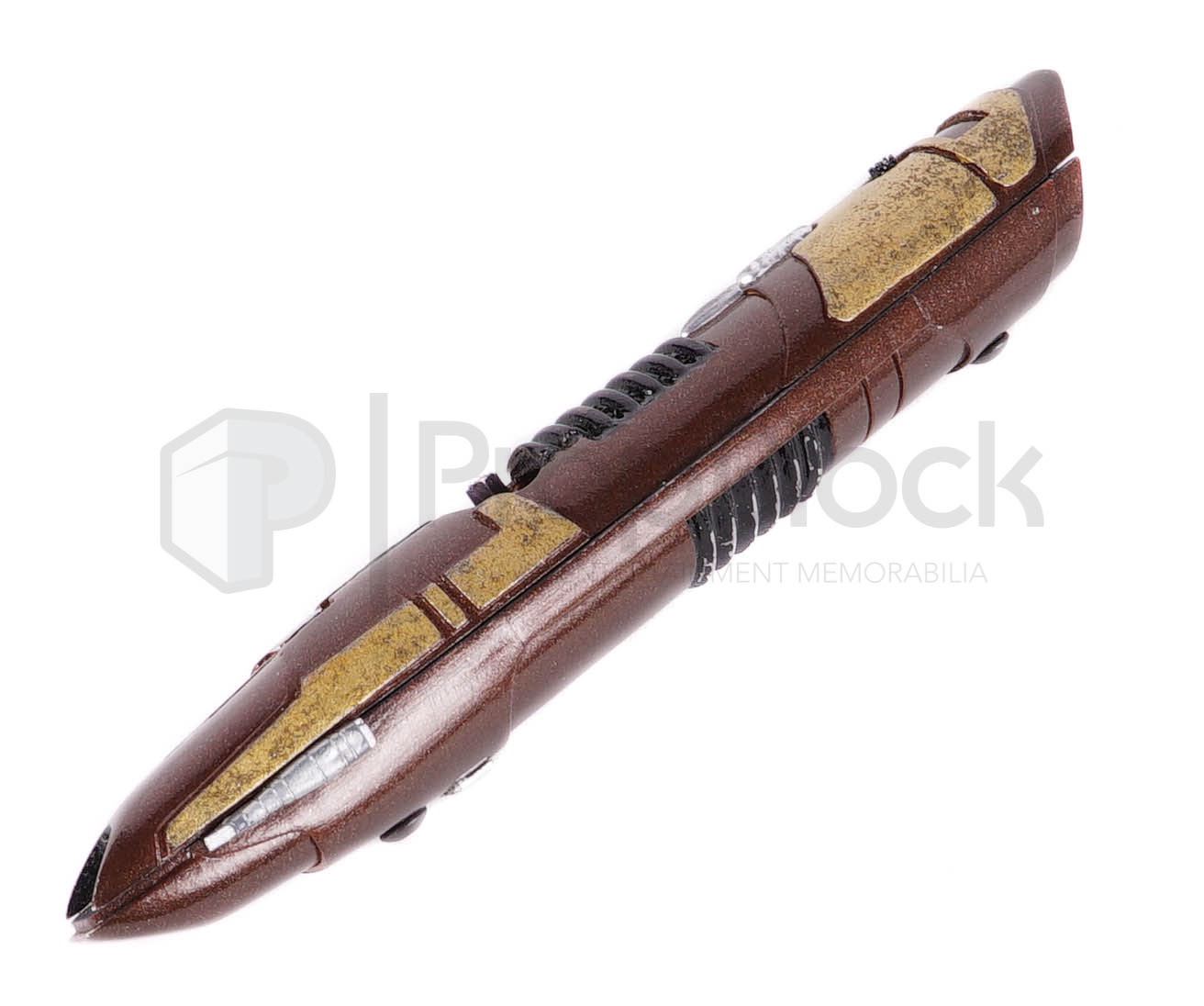 Cardassian style engineering tool featured in the production of Star Trek: Deep Space Nine. This piece is made of plastic and resin and is painted a gloss brown in color with various small intricate detailing's and gold accents. This item features small color LED lights on the body and emitter of the tool that are still functional. This piece comes from the collection of the Star Trek prop master Joe Longo and remains in good production used condition.