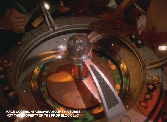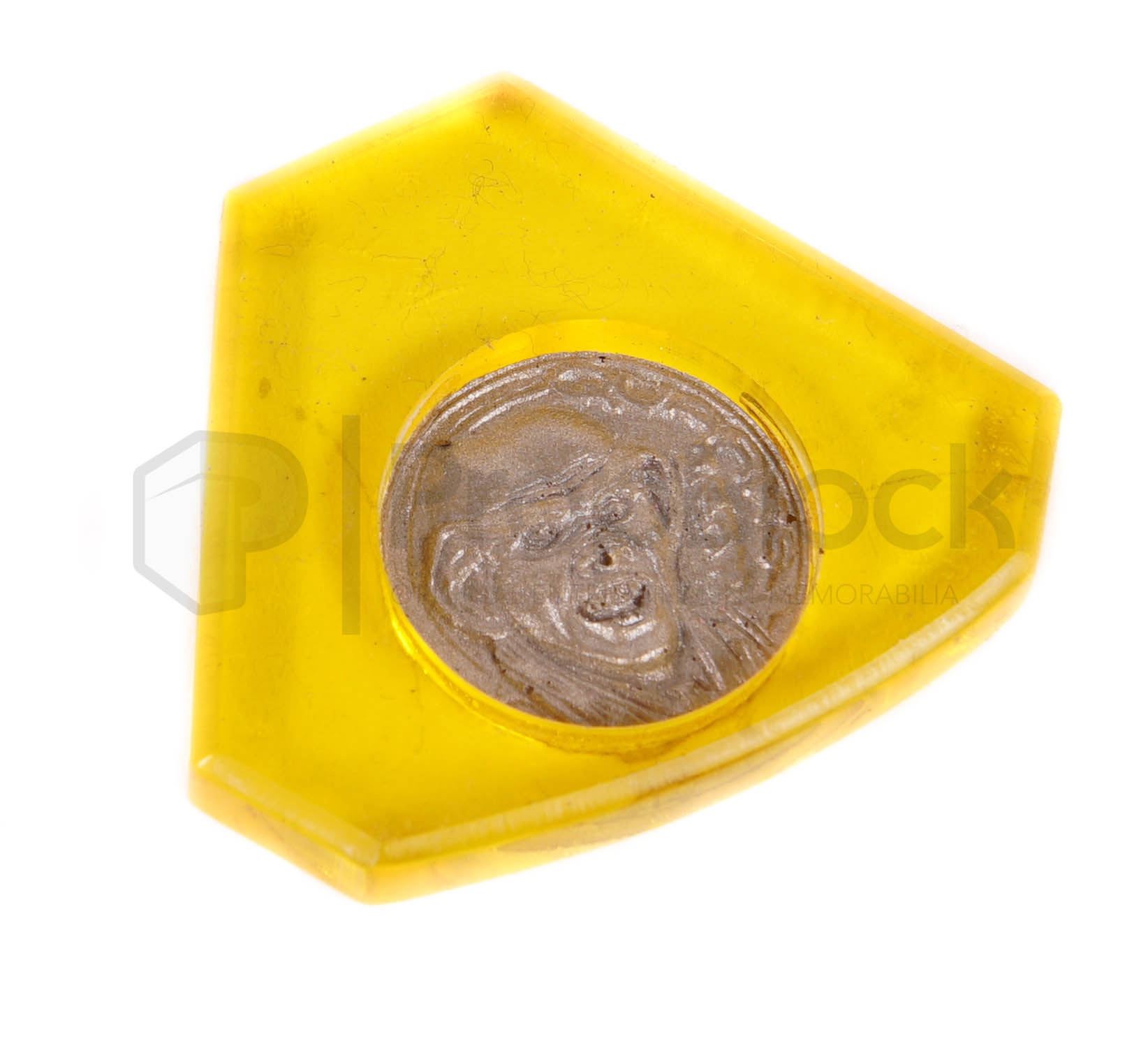 "Dabo" chip used in the bar at Quarks in Star Trek: Deep Space Nine. These were used as gaming chips while playing Dabo, a roulette style gambling game in Quarks bar. Made of yellow tinted clear acrylic, this piece features a small resin token in the middle with a raised image of Quark. This piece comes from the collection of the Star Trek prop master Joe Longo and remains in good production used condition.