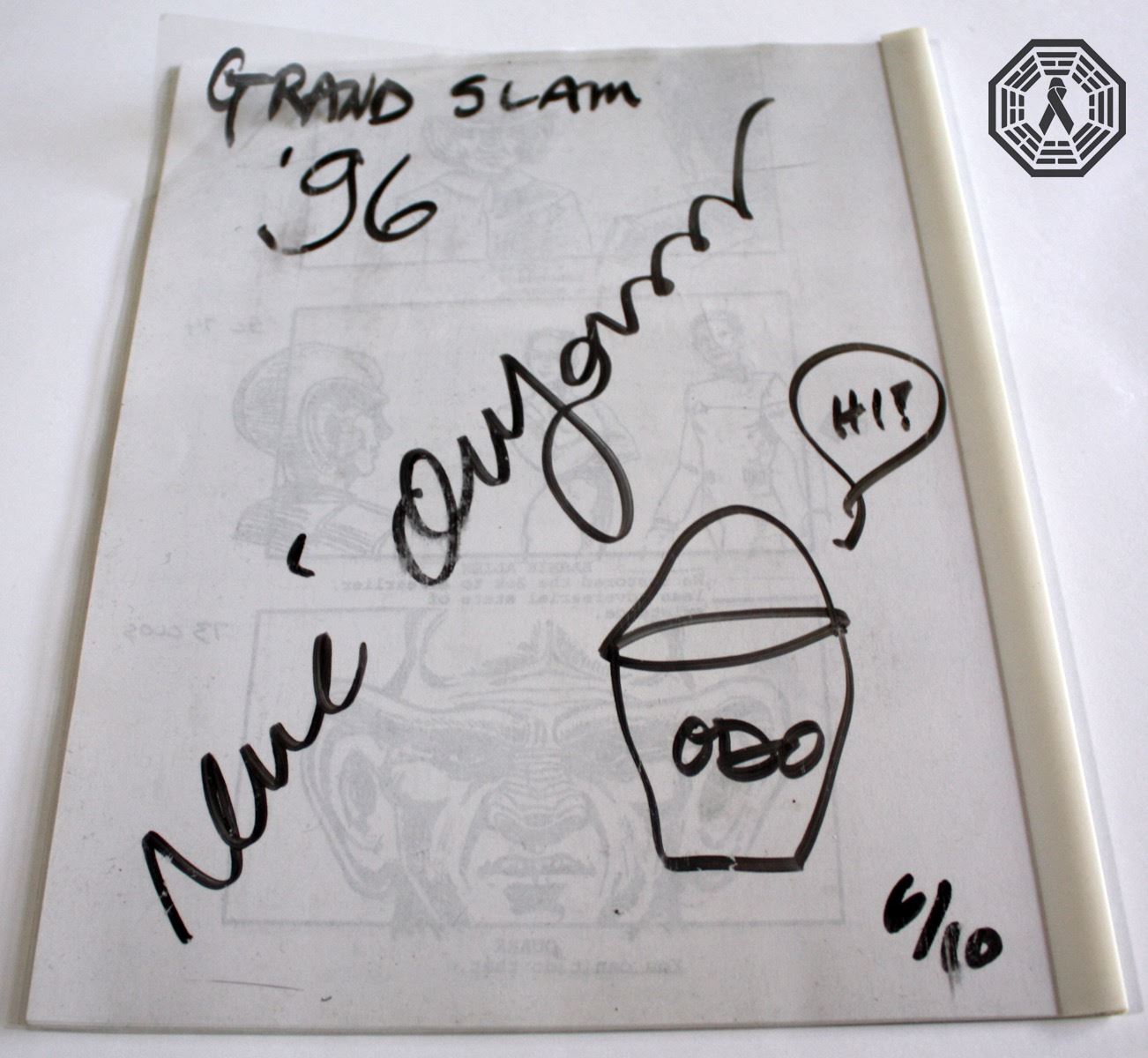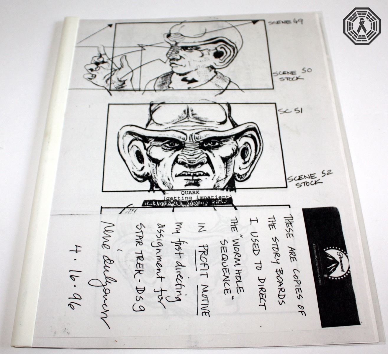 Star Trek: Deep Space Nine Rene Auberjonois' Director Storyboards. Black and white photocopies on 8.5 x 11 paper in plastic binder. Includes note from Rene, dated April 16, 1996. Signed by Rene on the back plastic cover. Limited edition, #6/10. Back plastic cover slightly dented, otherwise in fine condition. Donated by Mel M.