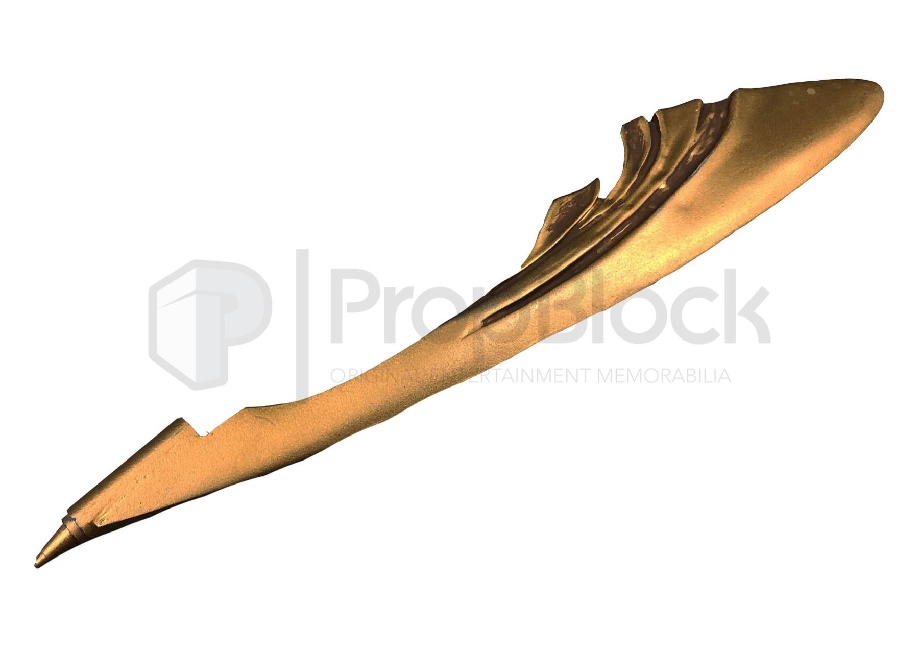 Ferengi style pen featured in the production of Star Trek: Deep Space Nine. This piece was used by the Ferengi members aboard Deep SPace Nine, and can also be seen being used various Starfleet personal as well. Made of cast resin, this item is painted a bright gold with engraved detailing. This pen has a faux pen tip at the end and is not functional. This item comes from the collection of Star Trek prop master Joe Longo and remains in excellent condition.