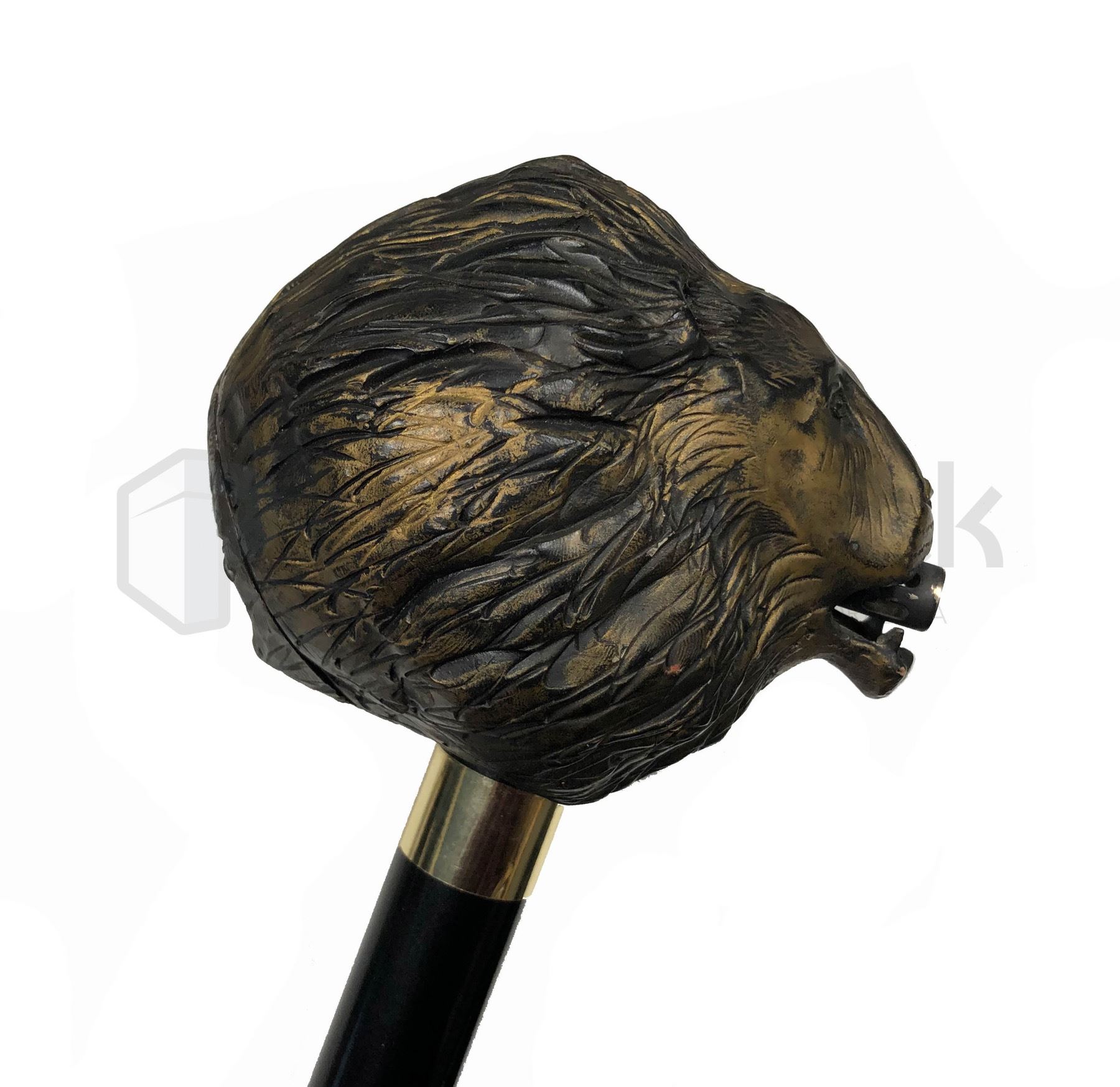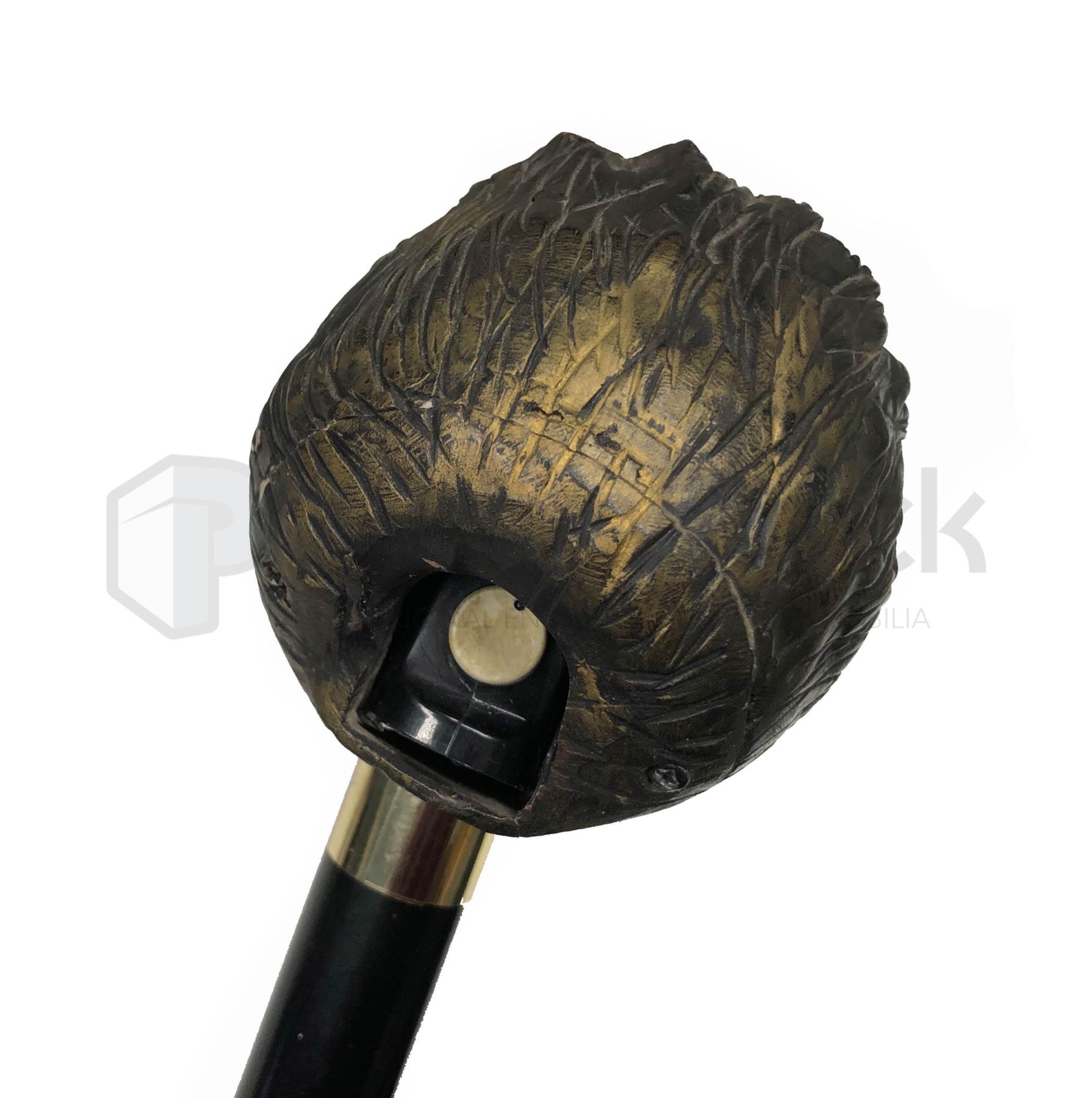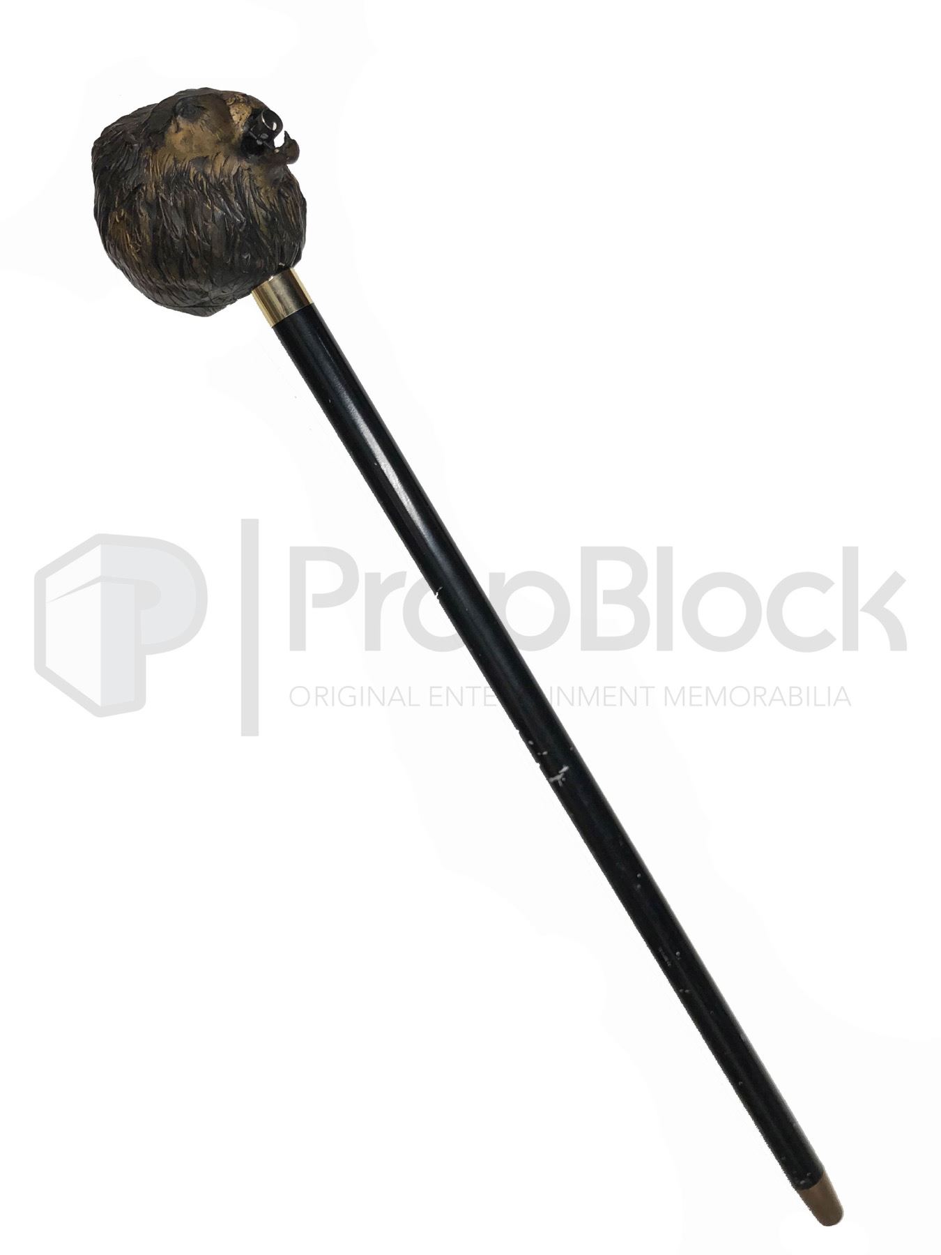 Hero version of the lion cane used by the character of Nog in the Star Trek: Deep Space Nine season seven episode "It's only a paper moon". In the episode Vic gives Nog a lion's head cane, a copy of a cane that Errol Flynn once had. There were various versions of the cane used in the series, this is the hero version used by Nog when he first received it. The head of the cane was custom made of resin and fiberglass, and this piece features a custom made metal cane section with gold detailing. The head features a real lighter unit inside that when a button on the back is depressed ignites a small flame on the mouth of the lion. This piece comes from the collection of Star Trek prop master Joe Longo and remains in excellent, screen used condition.