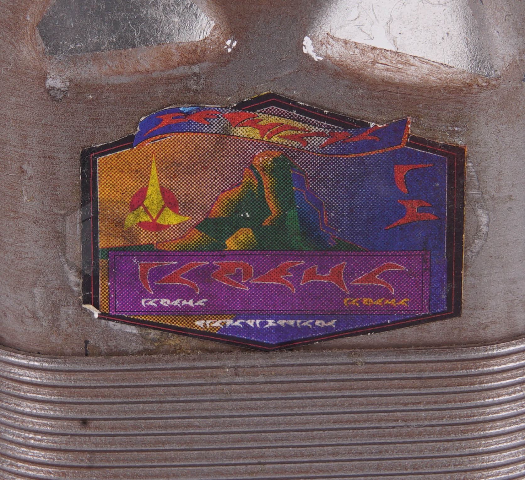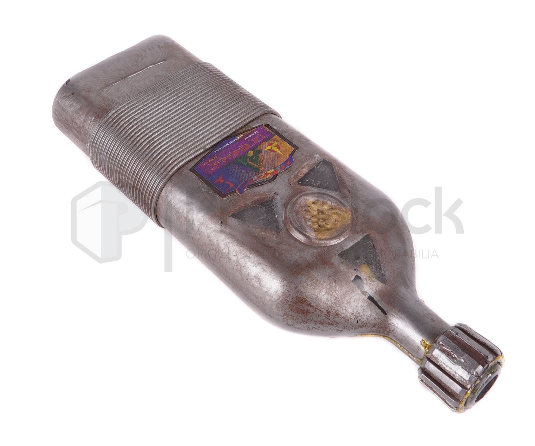 Blood wine bottle featured at Quarks bar in Star Trek: Deep Space Nine. The main drink of Klingons, this style bottle differs from the usual Blood wine bottles seen in the series, and was featured behind the bar at Quarks. Made of glass, this piece is painted silver with attached plastic "ribbing" details and a color graphic on the front. The bottle is missing some of the plastic detailing but remains in excellent screen used condition. This piece is from the collection of the Star Trek prop master Joe Longo.