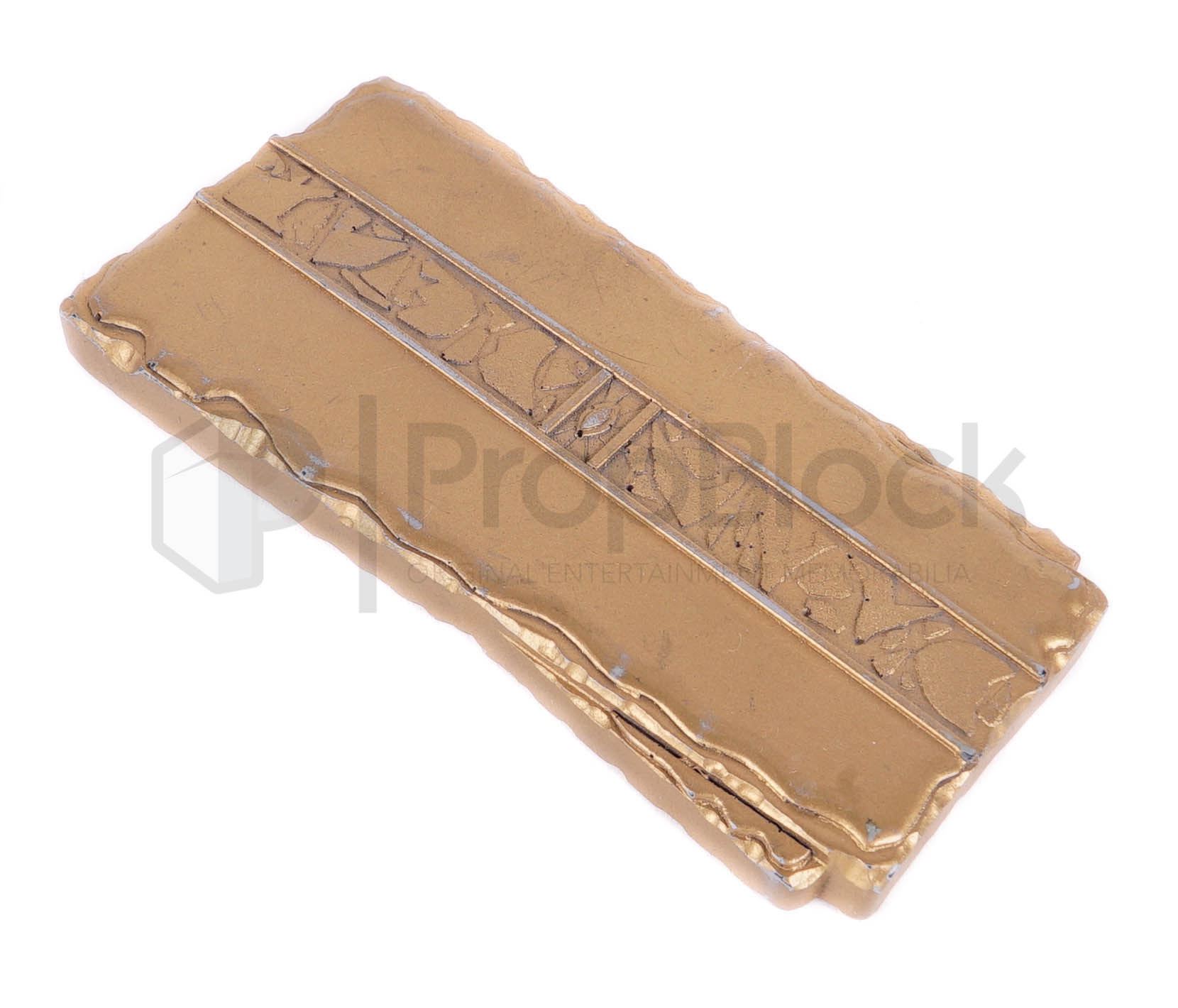Large piece of gold-pressed Latinum featured in the production of Star Trek: Deep Space Nine. Latinum is a rare silver-colored liquid used as currency by the Ferengi Alliance and many other worlds. For ease of transaction, latinum is usually suspended within gold as a binding medium to produce gold-pressed latinum. This lot features a large strip made of cast resin and has been painted gold. This piece comes from the collection of the Star Trek prop master Joe Longo and remains in good production used condition.