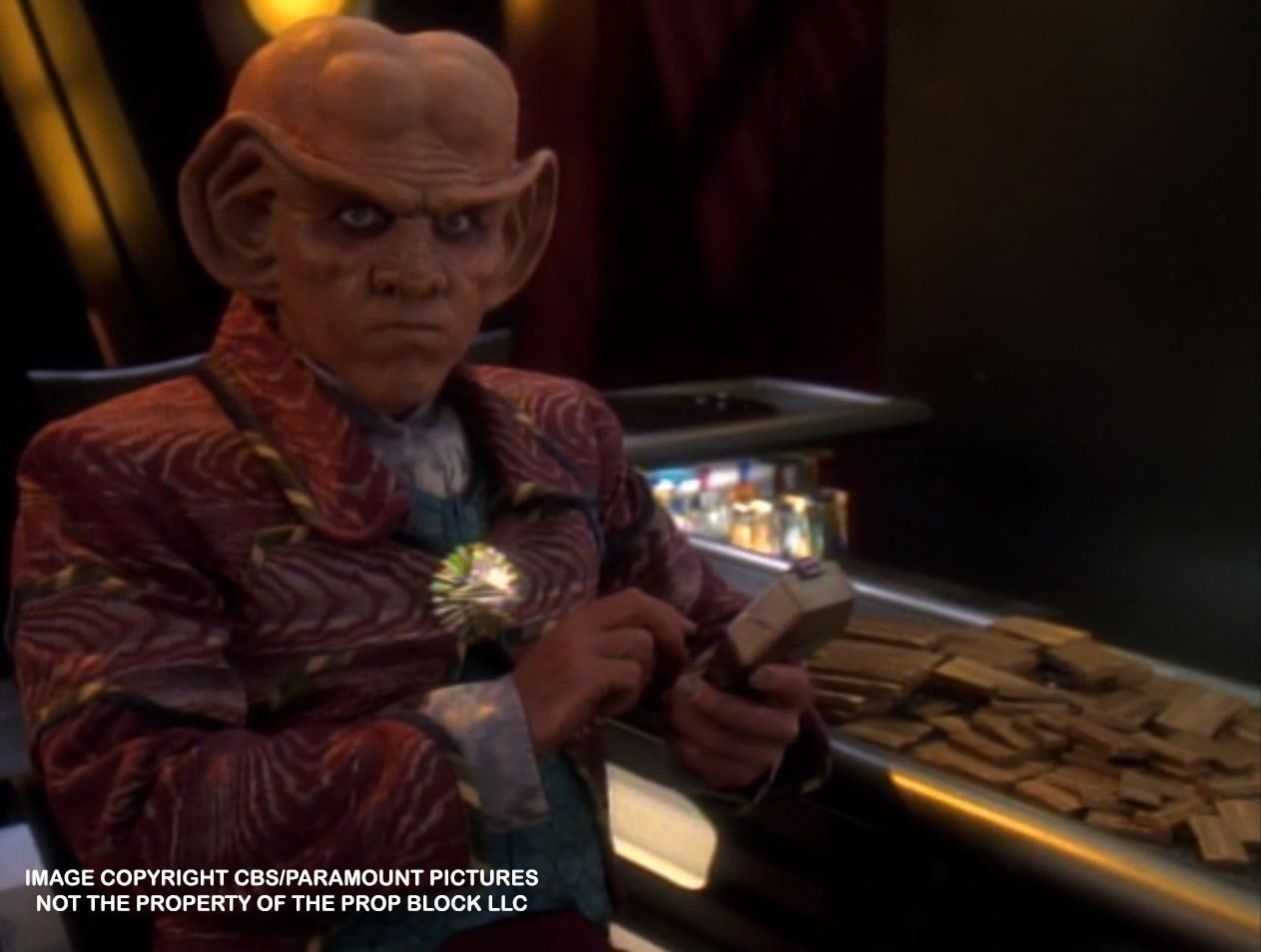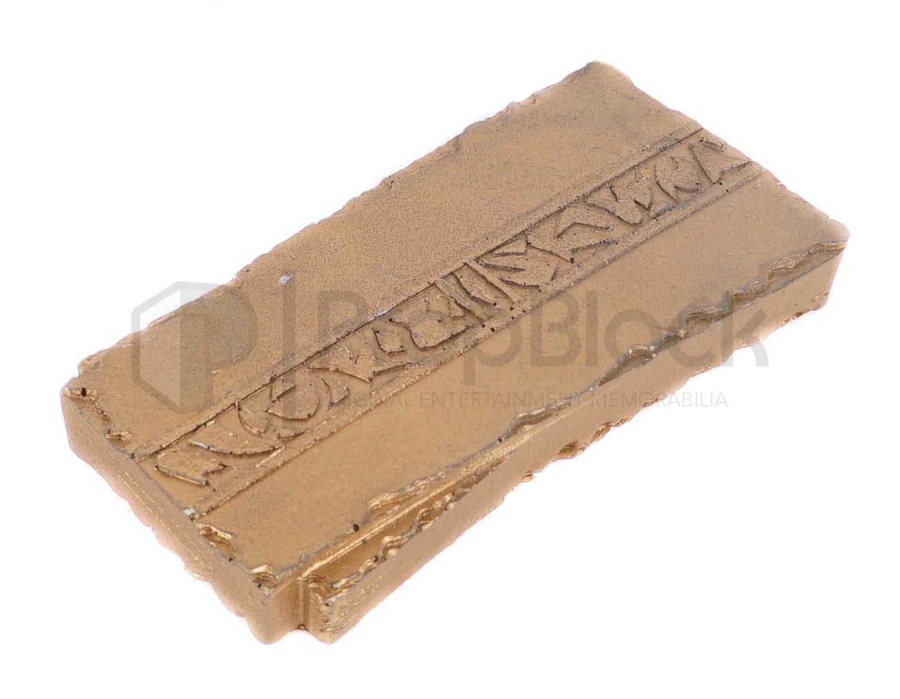 Medium sized piece of gold-pressed Latinum featured in the production of Star Trek: Deep Space Nine. Latinum is a rare silver-colored liquid used as currency by the Ferengi Alliance and many other worlds. For ease of transaction, latinum is usually suspended within gold as a binding medium to produce gold-pressed latinum. This lot features a medium strip made of cast resin and has been painted gold. This piece comes from the collection of the Star Trek prop master Joe Longo and remains in good production used condition.