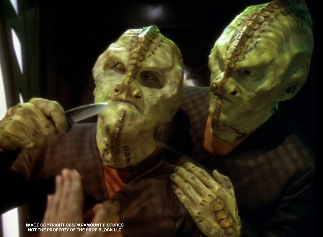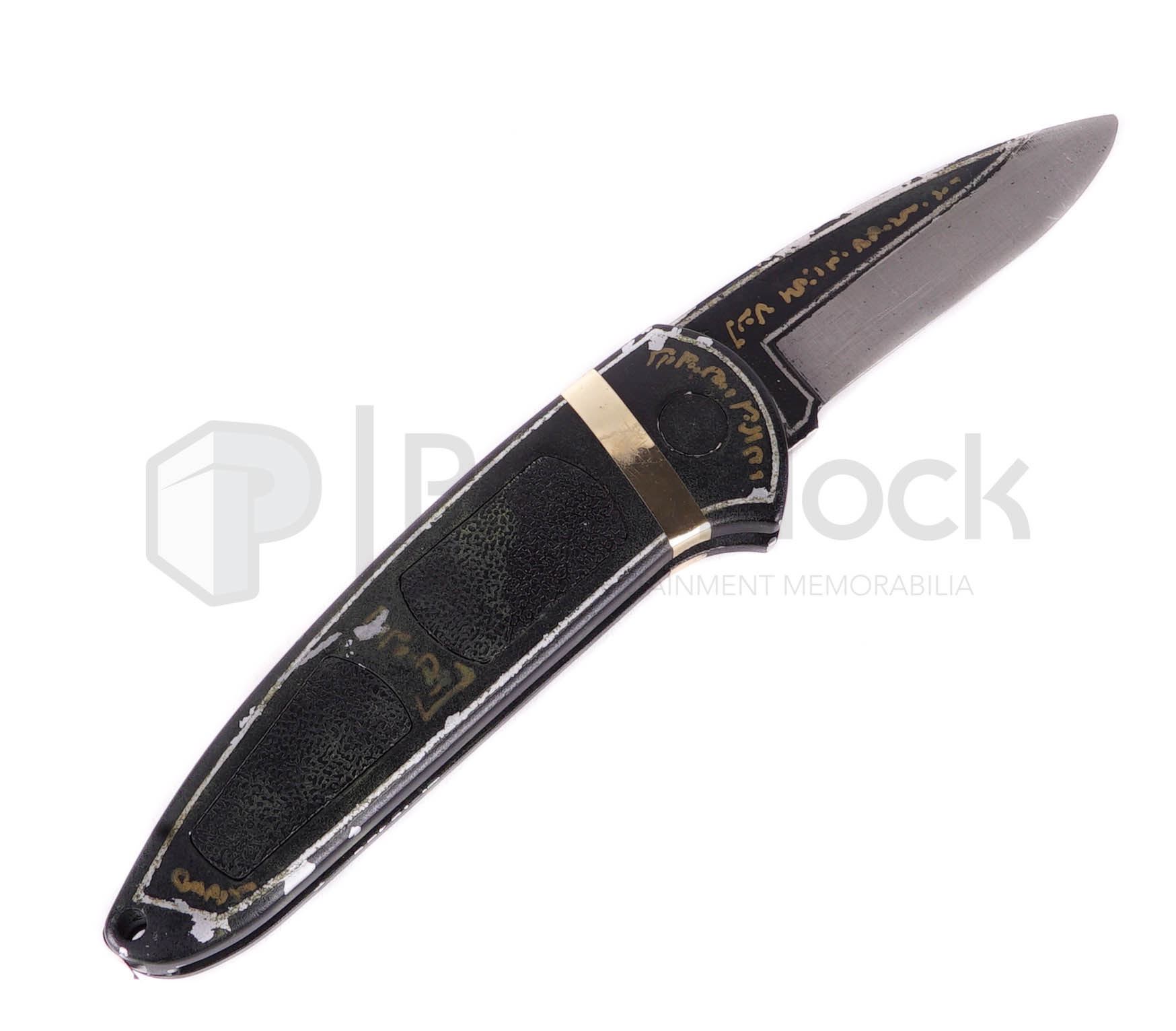 Switchblade knife used by the character of "Nahsk" in the Star Trek: Deep Space Nine episode "Who Morns for Morn ". Nahsk can be seen holding this blade to the throat of Quark while threatening him over Morn's fortune. This piece features a black plastic handle with folding metal blade, both of which have accents in an alien language painted in gold. This piece comes from the collection of the Star Trek prop master Joe Longo and remains in good production used condition.