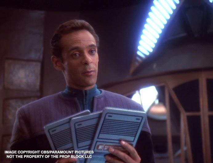 Starfleet style PADD (Personnel Access Display Device) featured in Star Trek: Deep Space Nine. This specific PADD was used in numerous episodes of the series, most noticeably in the season six episode "Statistical Probabilities", where Dr. Bashir can be seen holding it. Made of resin and plastic, this piece is grey in color with applied black line detailing on the back. There is a small burn mark in the graphic on the front section of the PADD in the lower right hand section from use on set. This piece comes from the collection of the Star Trek prop master Joe Longo and remains in good production used condition.
