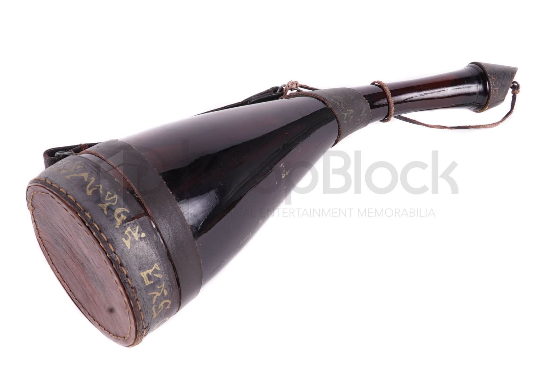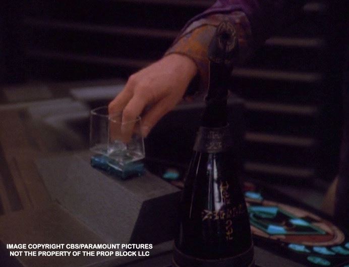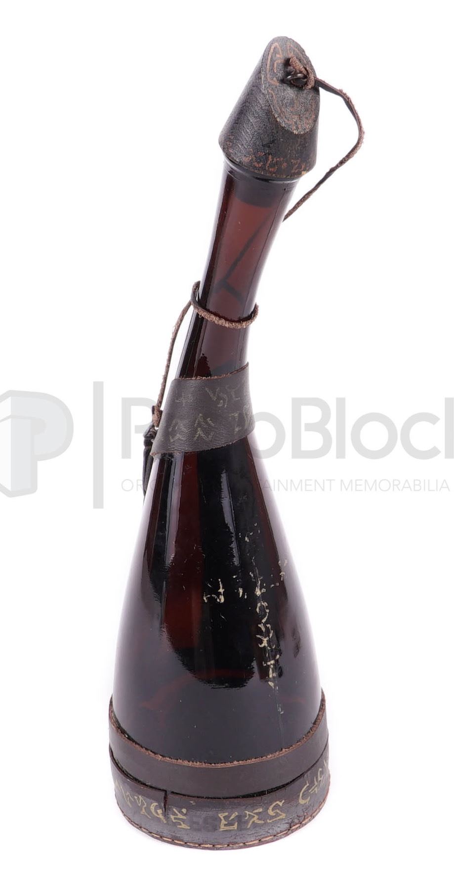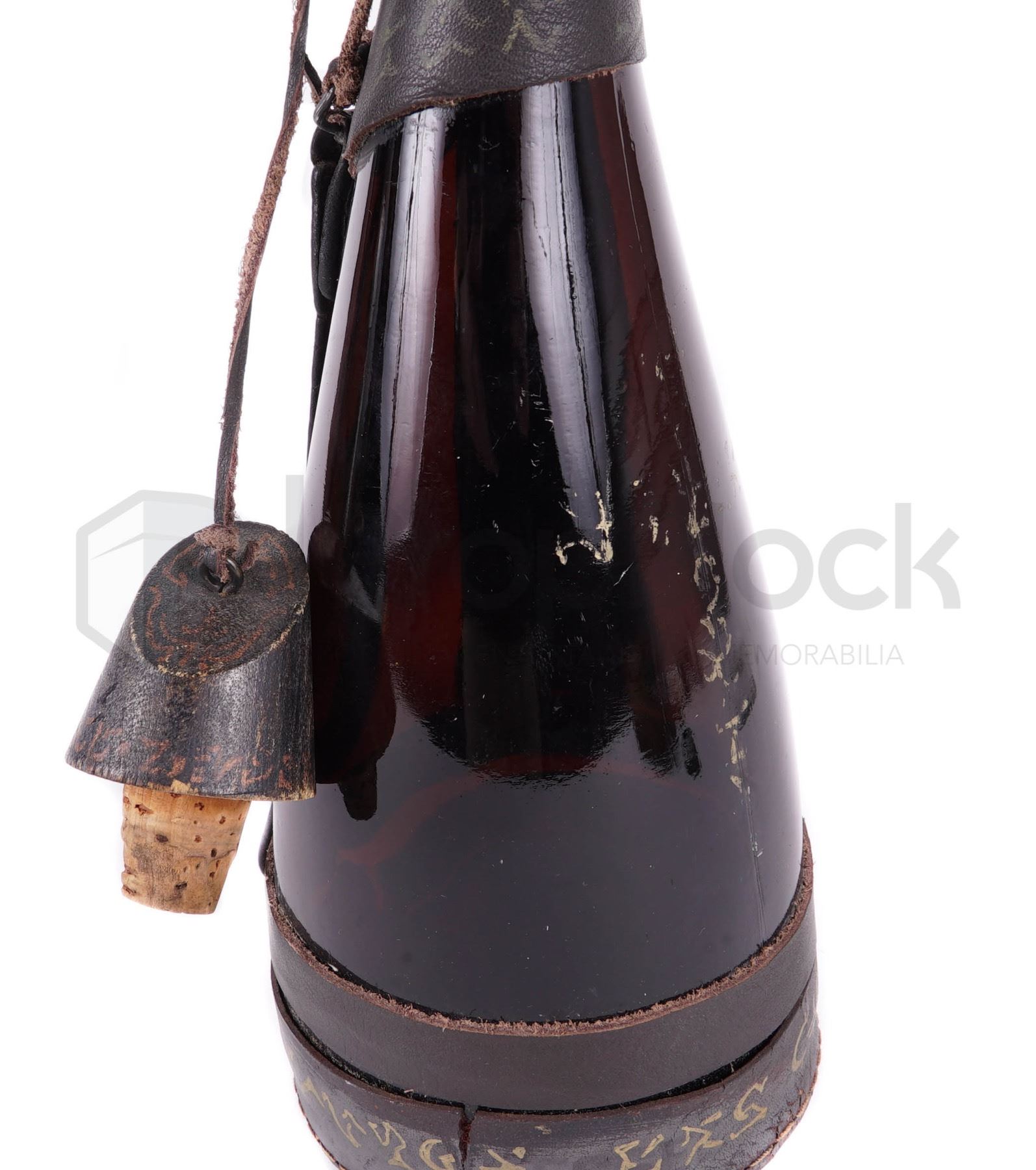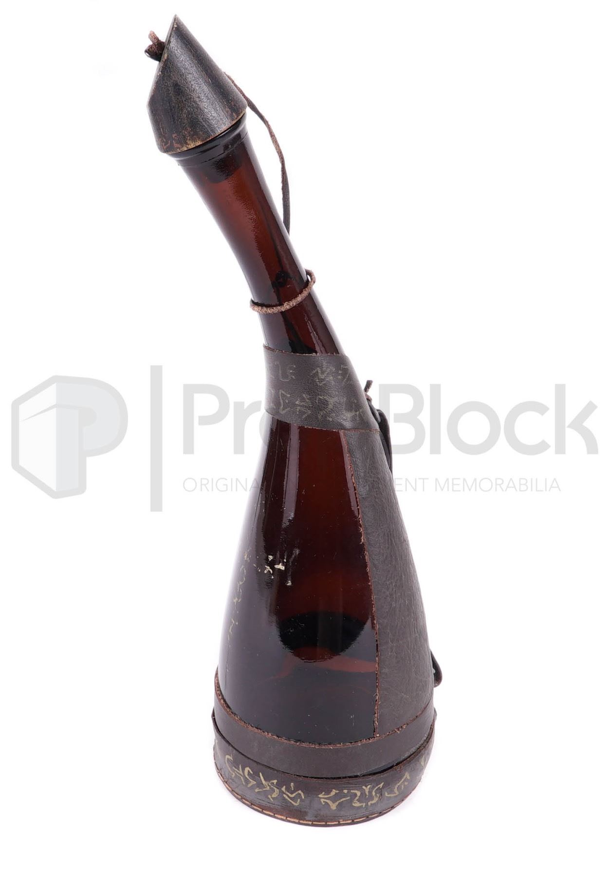 Hero style Saurian Brandy bottle used in Star Trek: Deep Space Nine. Saurian Brandy was first introduced in The Original Series, where it was later featured in each following series. This bottle was used by Quark and can be seen in various episodes behind the counter of his bar. This specific bottle was also used in "Prophet Motive" where Quark has a bottle delivered to his quarters and in the episode "Facets", where Curzon Dax can be seen drinking from it. This bottle is made of glass and was altered from a "Dickle" whiskey bottle. This piece features custom made dark brown leather wraps around the base that travel to the top and features gold lettering on the front and around the leather on the base and neck of the bottle. This piece comes from the collection of the Star Trek prop master Joe Longo and remains in good production used condition.