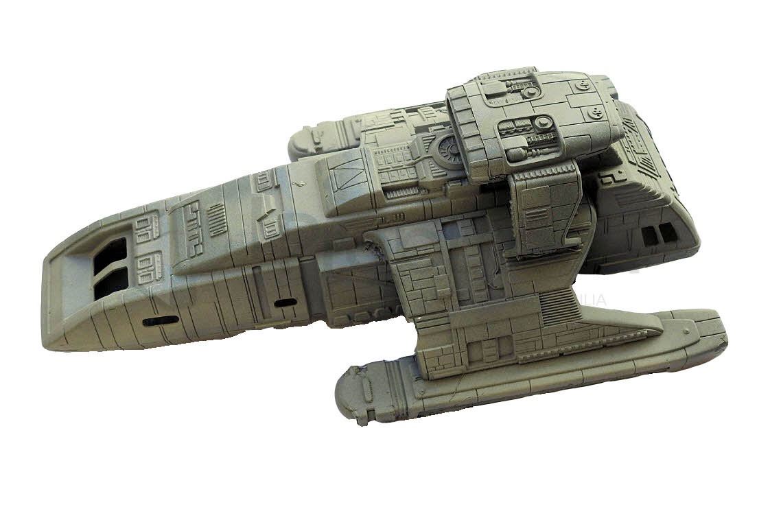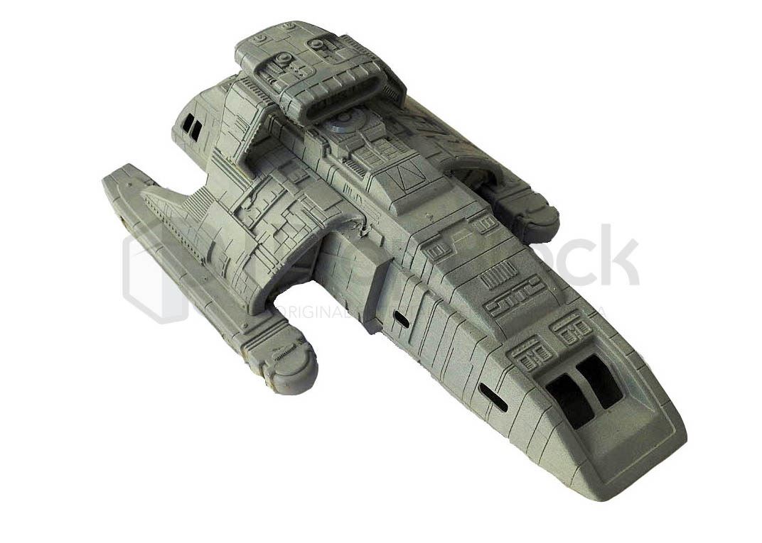 Camera Test model of the Star Trek: Deep Space Nine shuttlecraft, the Runnabout. This is a built commercially available model that was used by the production to plot scenes, and as a stand in on the larger set models. This piece is made of injection molded plastic and has been painted a muted grey. This item remains in excellent, production used condition. Item measures 12.5" x 7.5" x 4".