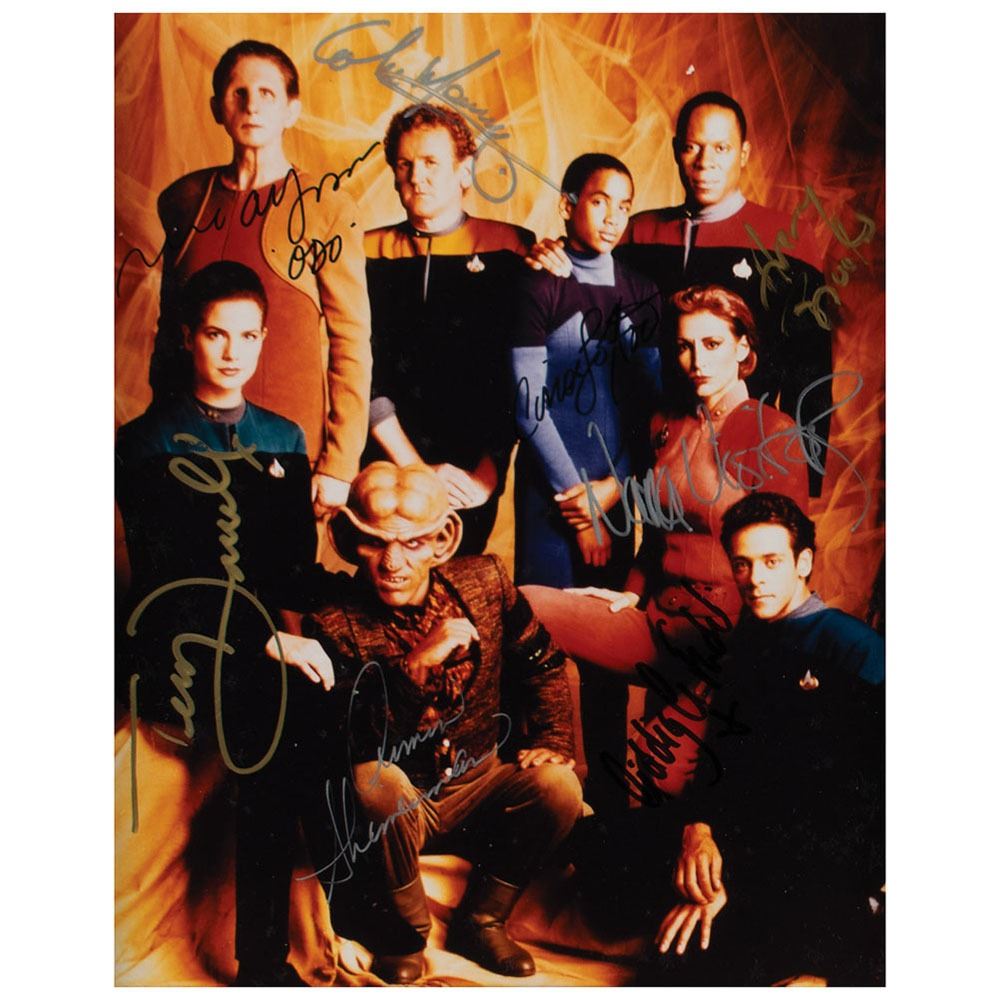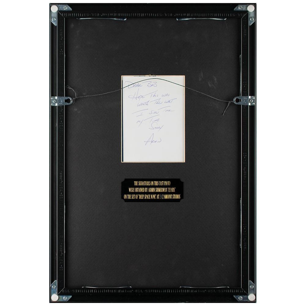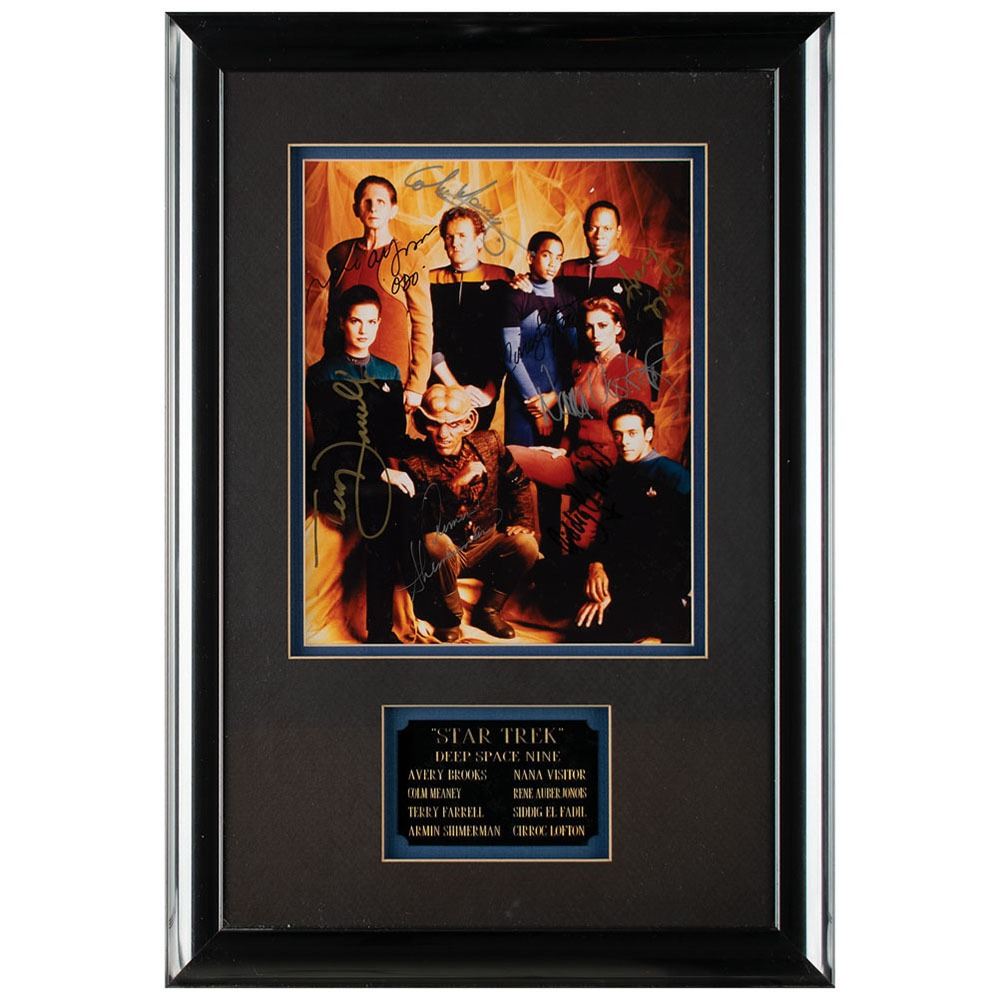 Color glossy 7.5 x 9.5 photo of the Star Trek: Deep Space Nine cast, signed in various inks by Avery Brooks, Colm Meaney, Terry Farrell, Armin Shimerman, Nana Visitor, Rene Auberjonois, Siddig el Fadil, and Cirroc Lofton. Nicely double-matted and framed with a plaque to an overall size of 13.25 x 19.25; on the reverse is a handwritten note by Armin Shimerman, who evidently acquired the autographs: "Hope this was worth the wait. I sure took my time." In fine condition.