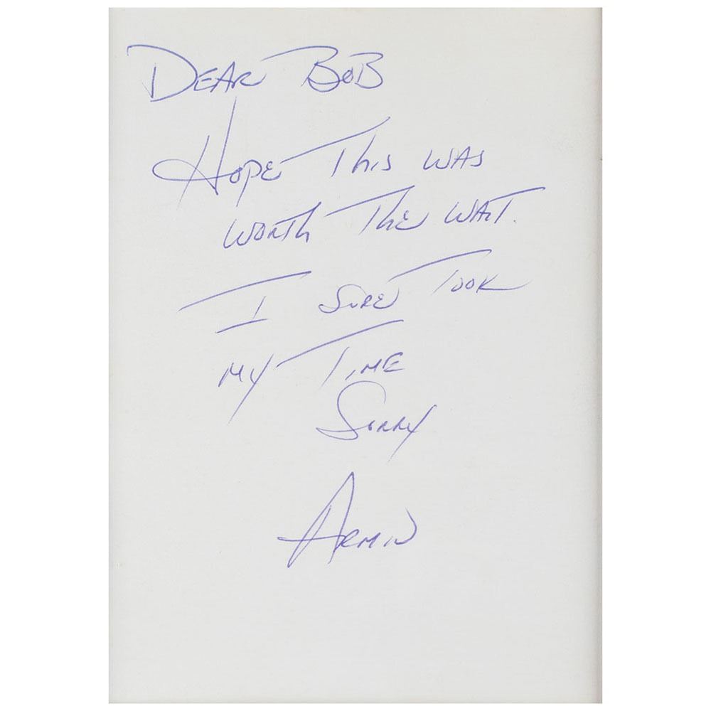 All lots sold by RR Auction are accompanied by an Auction Certificate ("AC”). On any lot presented with an AC issued by RR Auction, the certification is only as to its attribution to the person or entity described or to the lot's usage and only as explicitly stated therein (the "Certification of Authenticity”), to the exclusion of any other warranties, express or implied, including but not limited to those pursuant to the Uniform Commercial Code. The Certification of Authenticity inures only to the original Bidder (as shown in RR Auction's records). Bidder may not transfer, assign, or otherwise convey the Certification of Authenticity, and such purported transfer, assignment, or conveyance shall be null and void. The Certification of Authenticity is valid from date of the Auction in which Bidder was awarded the lot (the "Auction Date”) until five (5) years after the Auction Date, without exception.