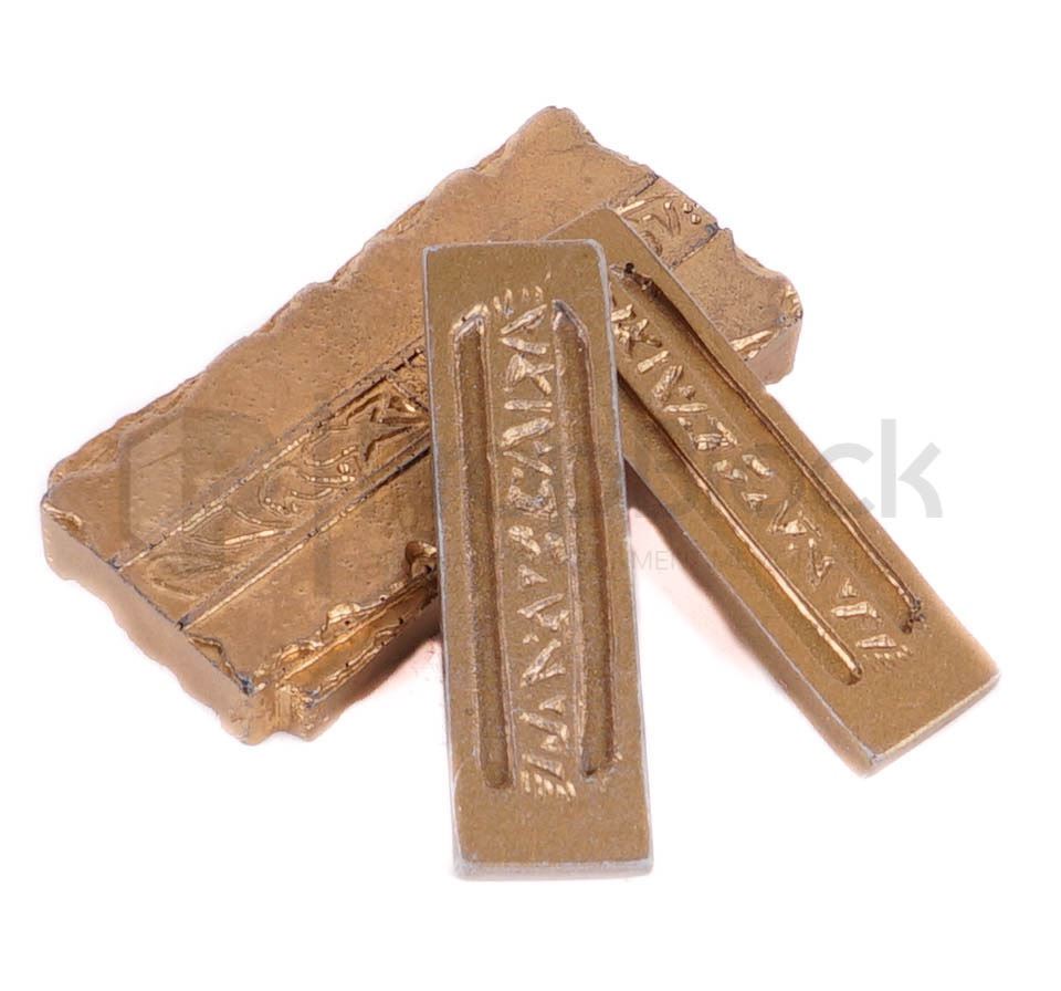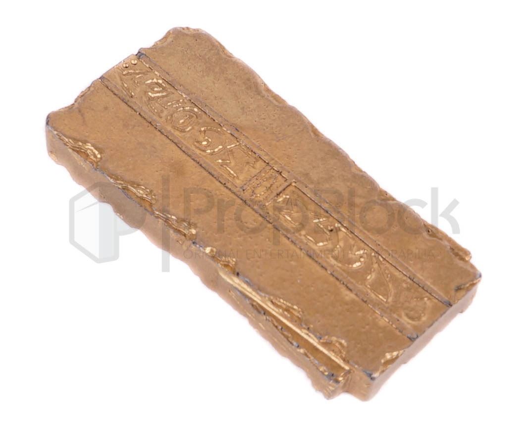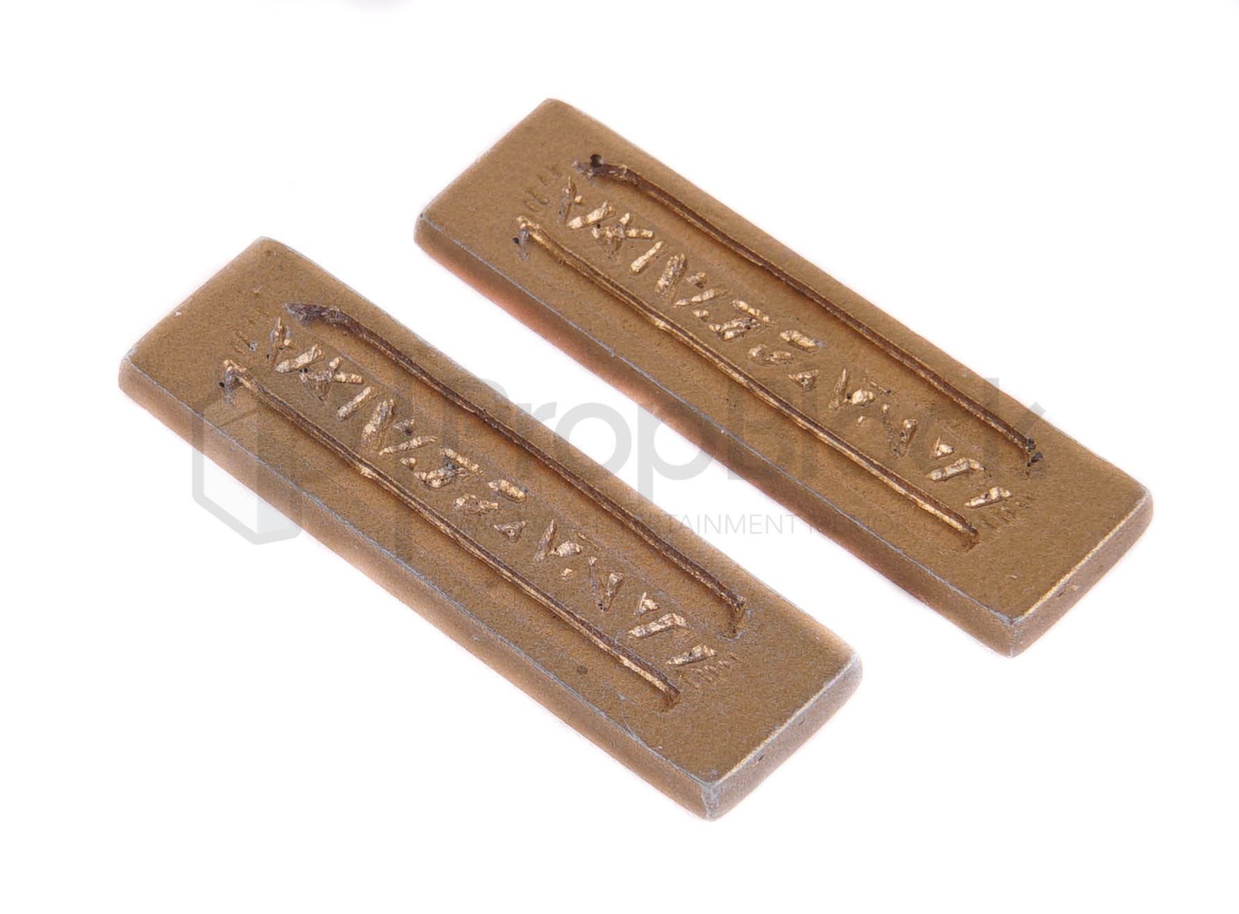 Small and strip sized pieces of gold-pressed Latinum featured in the production of Star Trek: Deep Space Nine. Latinum is a rare silver-colored liquid used as currency by the Ferengi Alliance and many other worlds. For ease of transaction, latinum is usually suspended within gold as a binding medium to produce gold-pressed latinum. This lot features a small piece and two smaller strips made of cast resin that have been painted gold. These pieces come from the collection of the Star Trek prop master Joe Longo and remain in good production used condition.