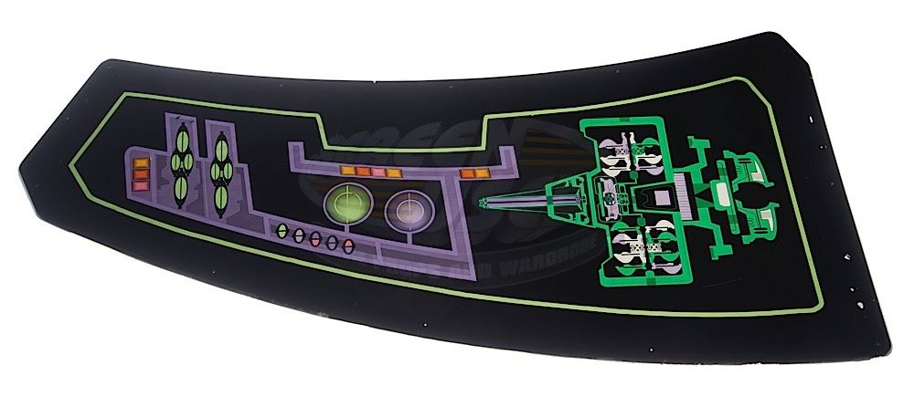 (Paramount-TV, 1993-99) This back-lit panel was custom-made by the production for use as set dressing in various episodes of Star Trek: Deep Space Nine, including the episode titled "The Search, Part 1". The back-lit panel is an asymmetrically shaped computer interface made from a piece of smoked acrylic with graphical applications adhered to the reverse. Minor wear from use is present, measures 48.5" x 22.5". In addition to our ScreenUsed COA, this panel comes with its original "It's A Wrap!" COA.