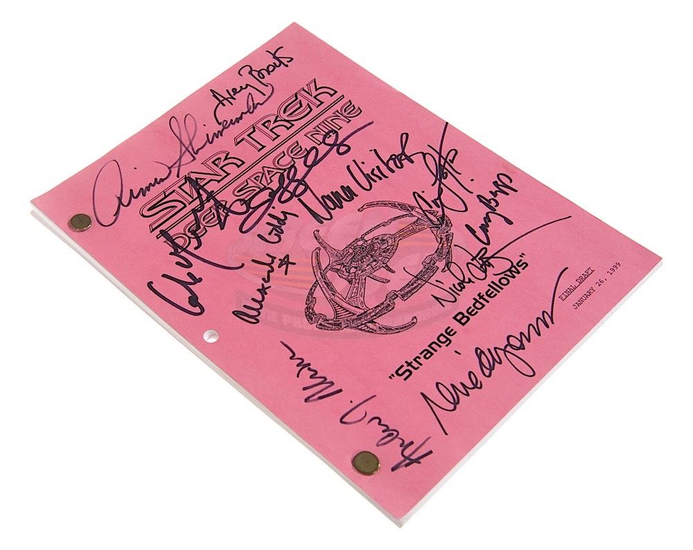 (Paramount-TV, 1993-99) This 54 page production script is titled "Strange Bedfellows" and dated January 26, 1999. The script has been autographed on the cover by: