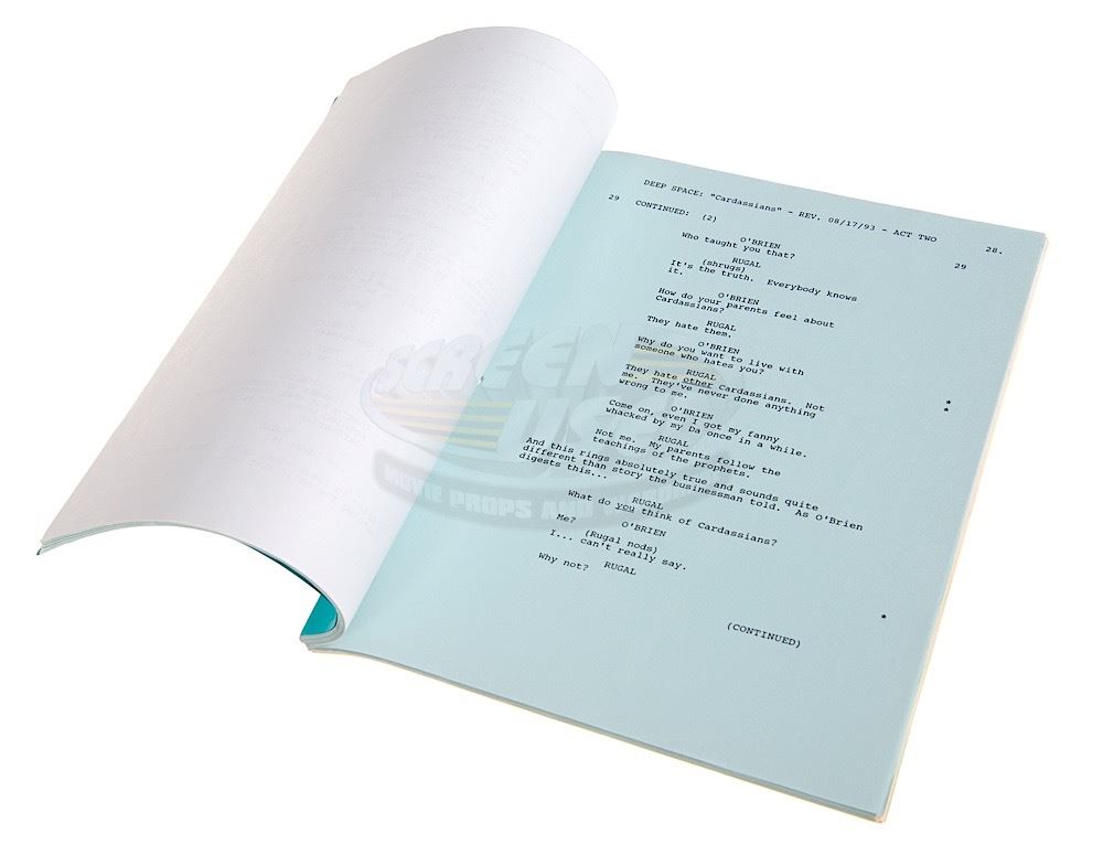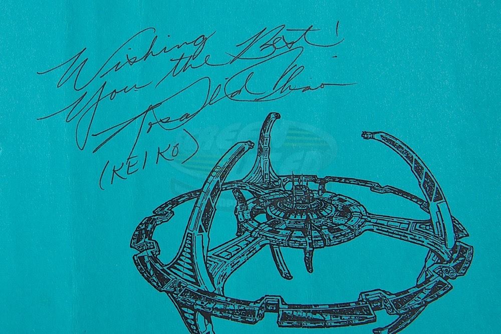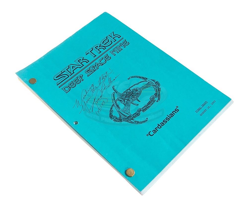 This 61 page production script is titled "Cardassians" and dated August 16, 1993. The script has been autographed on the cover by Rosalind Chao (Keiko O'Brien), with the inscription "Wishing you the best!" The script features multi-colored pages and has minor wear from use.