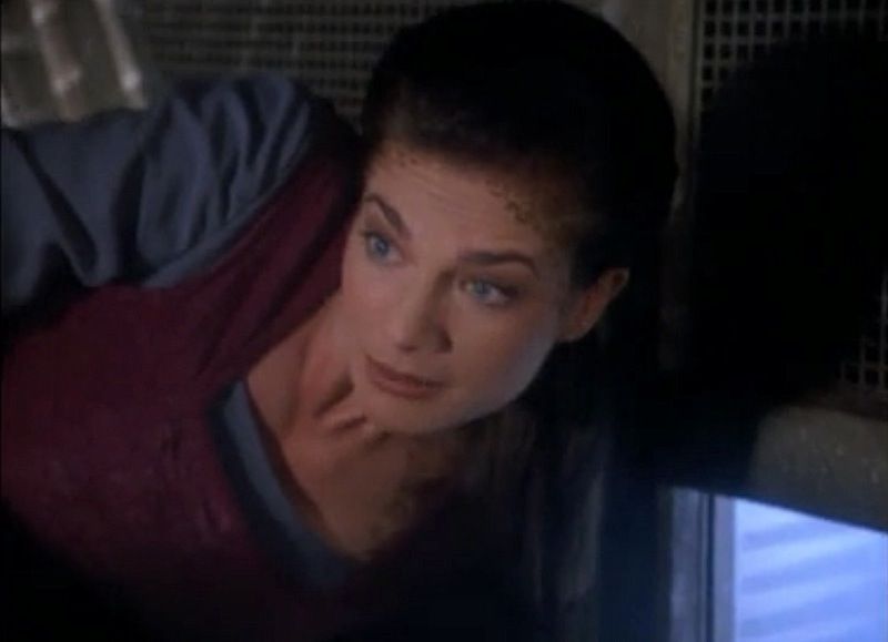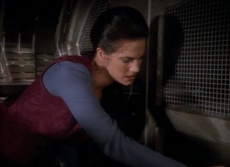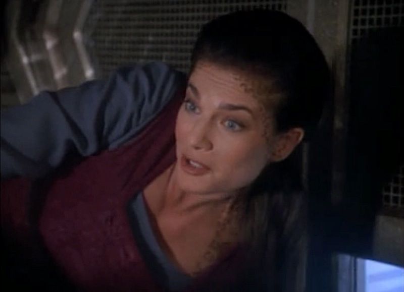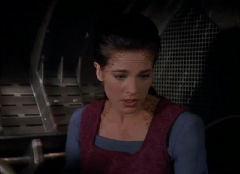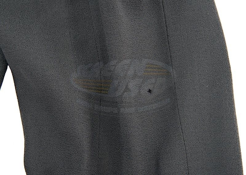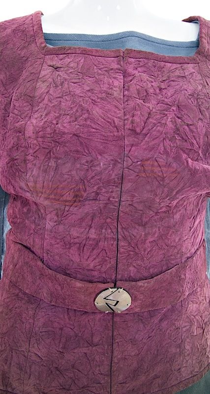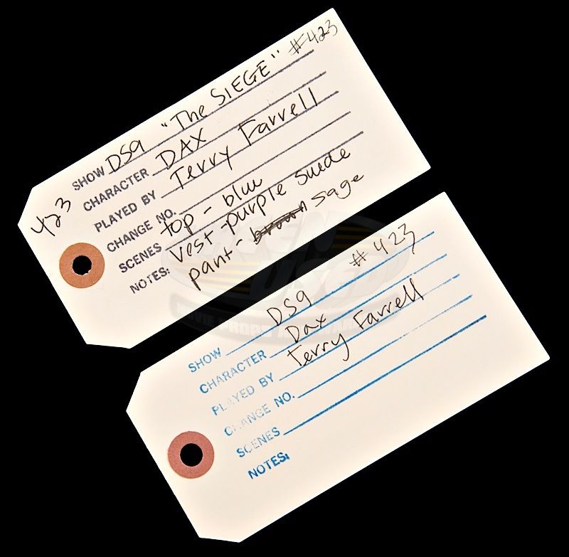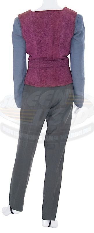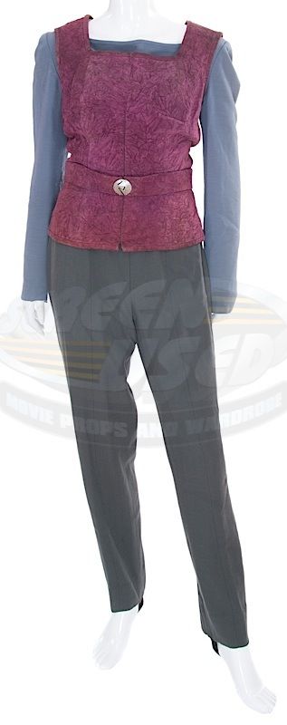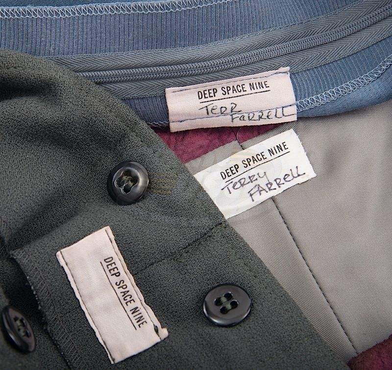 (Paramount Television, 1993-99) A costume featured in the Star Trek: Deep Space Nine episode "The Siege". Following the evacuation of station personnel due to a take over by radical elements within the Bajoran military, the Starfleet crew of "Deep Space Nine" dons civilian clothes while thwarting the invaders. "Jadzia Dax" (Terry Farrell) escapes to warn the Bajoran government of the threat posed by the military in this costume, a sage colored pair of pants, a blue long sleeved shirt with a squared off neckline, and a purple suede vest. The costume comes with two costumer's tags indicating use in the episode and all three garments feature sewn in Deep Space Nine tags.