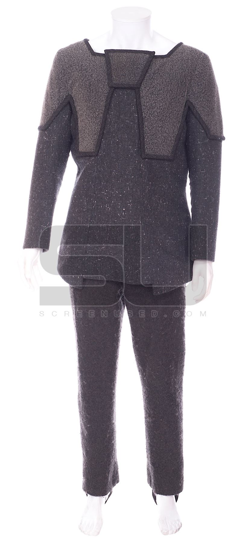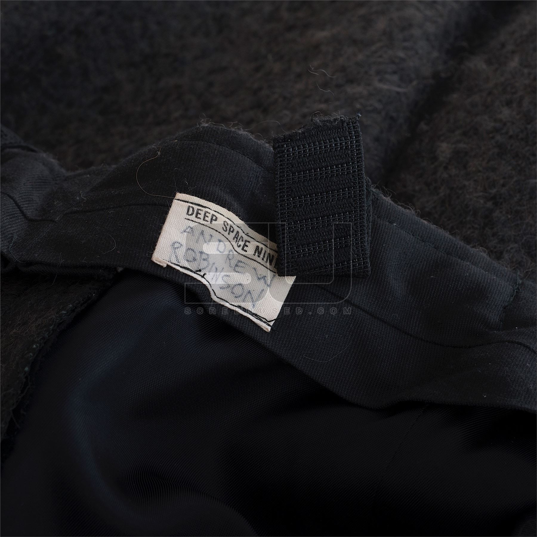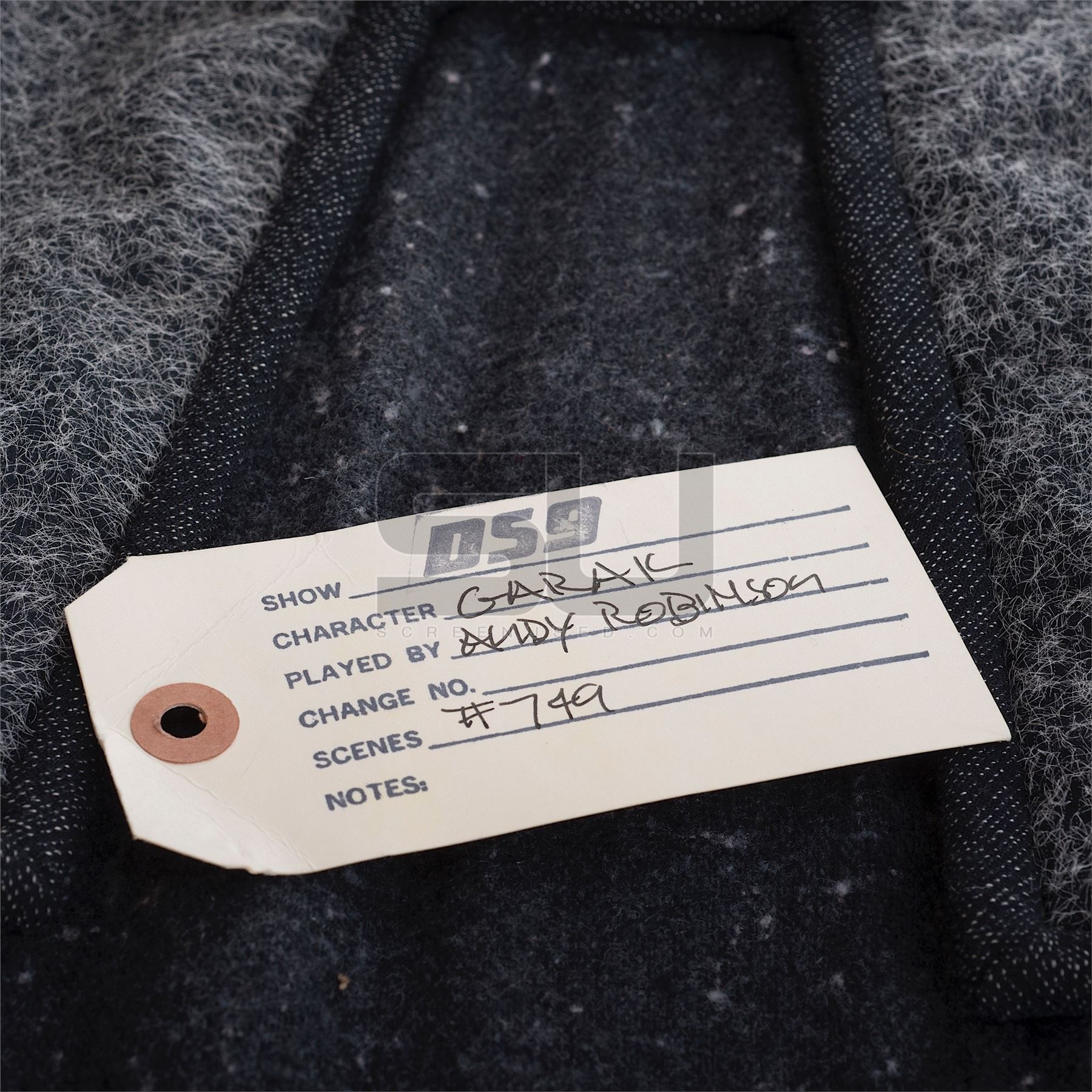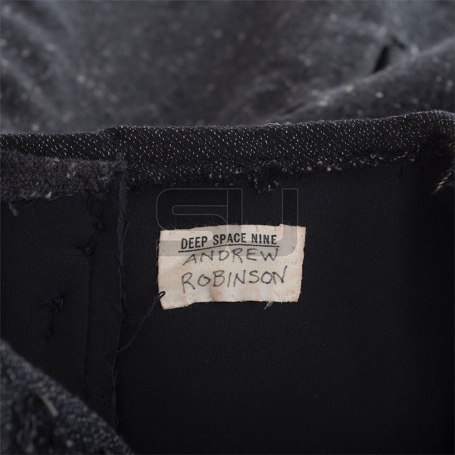 This costume was created by the production for use by Andrew Robinson as "Garak" in the last few episodes of the series. The costume consists of a pair of pants with suspenders and stirrups, along with a tunic made from wet suit type of material, covered in cloth. Both pieces have a costume tag with the actor's name on it, and the tunic has a costumers tag with character name, actor, and scene #749 handwritten. Along with our ScreenUsed COA, this piece includes the original It's A Wrap COA.