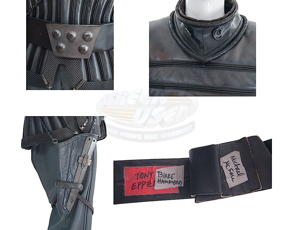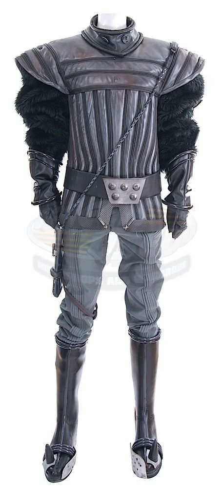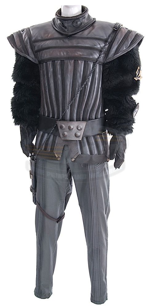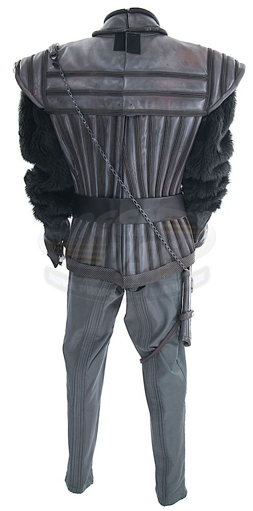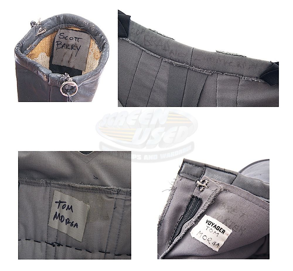 (Paramount Television, 1993-99) A Klingon costume appearing in Star Trek VI: The Undiscovered Country and various episodes of Star Trek: Deep Space Nine and Voyager. The costume is made up of gray Spandex trousers, and a black vinyl uniform top with vinyl accents, and black faux fur sleeves. The costume comes with a black leather gorget, black fingerless leather gloves, a disruptor holster with a metal shoulder aglet and chain, and a black leather belt with a resin buckle. The sleeves feature molded rubber "Klingon House" accents affixed via Velcro placements. Multiple names are written in the costume pieces and a Voyager tag indicate use by various actors, including "Bret Porter" who played "General Stex" in Star Trek VI. Wear from use is present. Included with the outfit are replica boots and gauntlets to give the costume a more complete look for display.