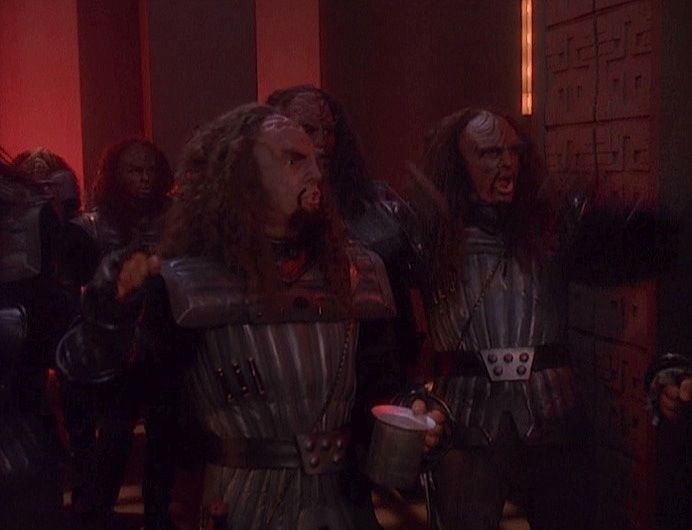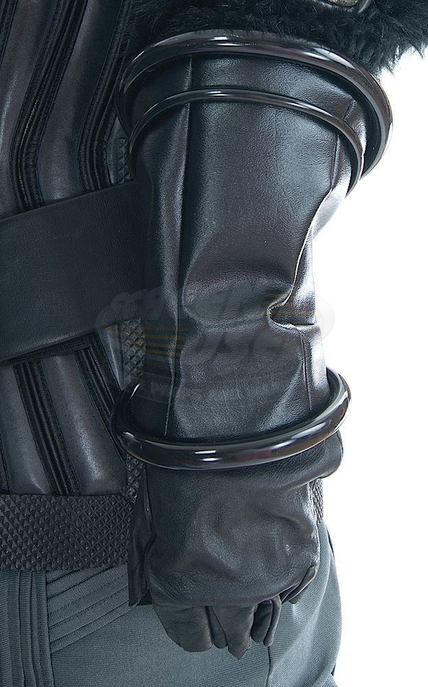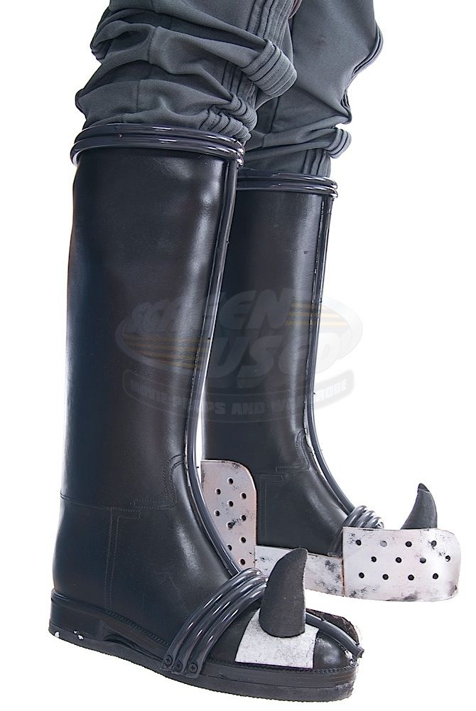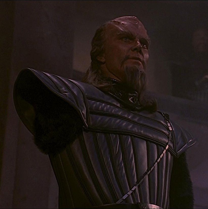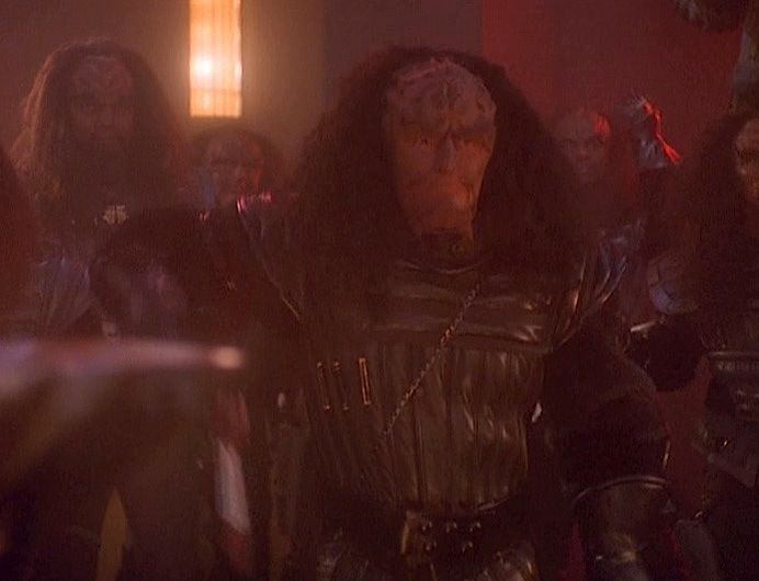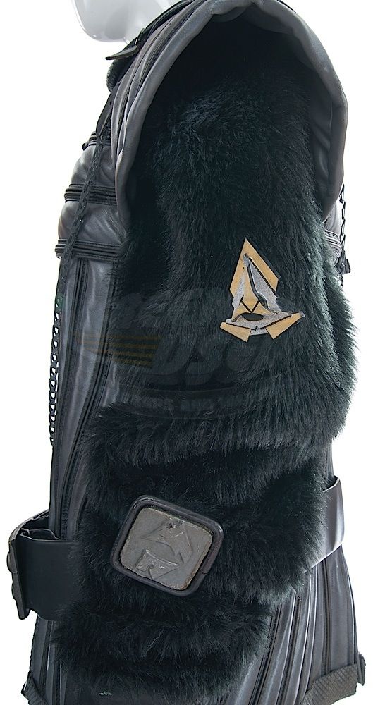 (Paramount Television, 1993-99) A Klingon costume appearing in Star Trek VI: The Undiscovered Country and various episodes of Star Trek: Deep Space Nine and Voyager. The costume is made up of gray Spandex trousers, and a black vinyl uniform top with vinyl accents, and black faux fur sleeves. The costume comes with a black leather gorget, black fingerless leather gloves, a disruptor holster with a metal shoulder aglet and chain, and a black leather belt with a resin buckle. The sleeves feature molded rubber "Klingon House" accents affixed via Velcro placements. Multiple names are written in the costume pieces and a Voyager tag indicate use by various actors, including "Bret Porter" who played "General Stex" in Star Trek VI. Wear from use is present. Included with the outfit are replica boots and gauntlets to give the costume a more complete look for display.
