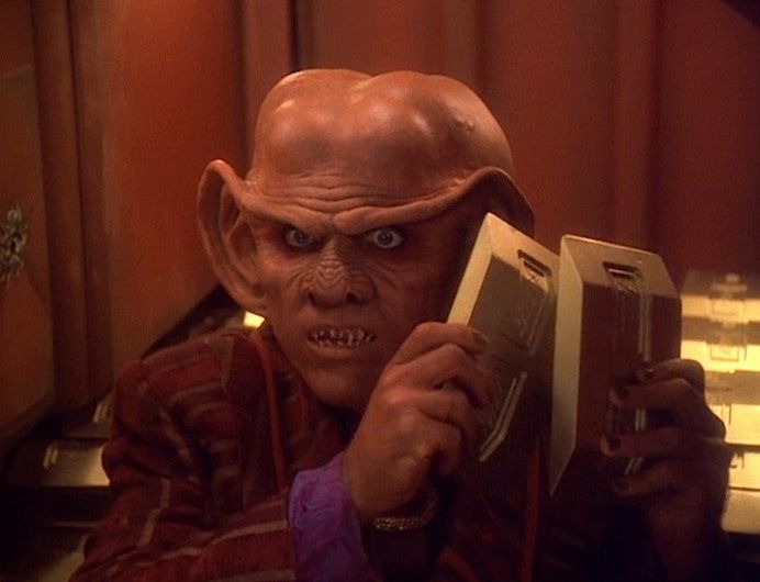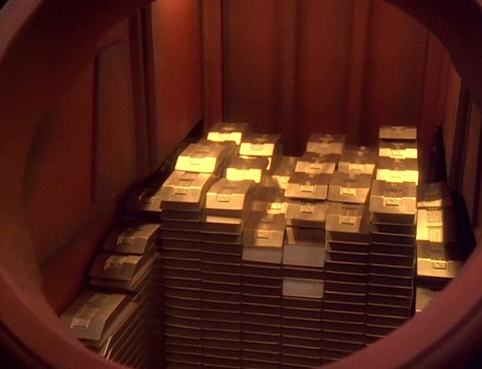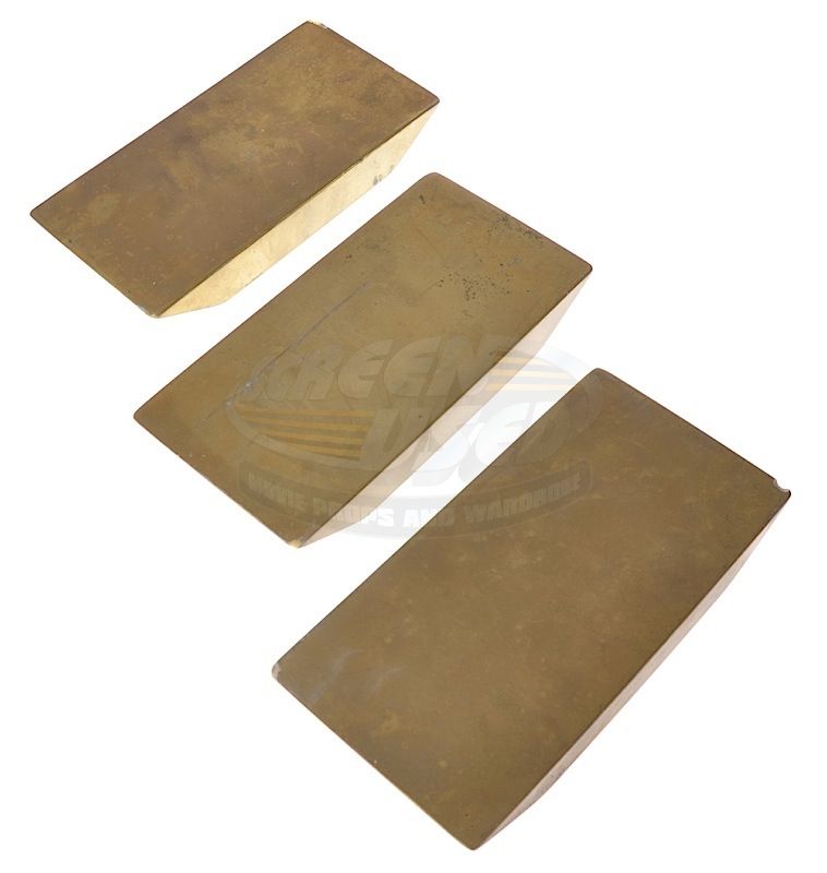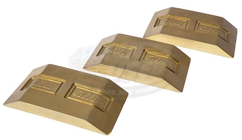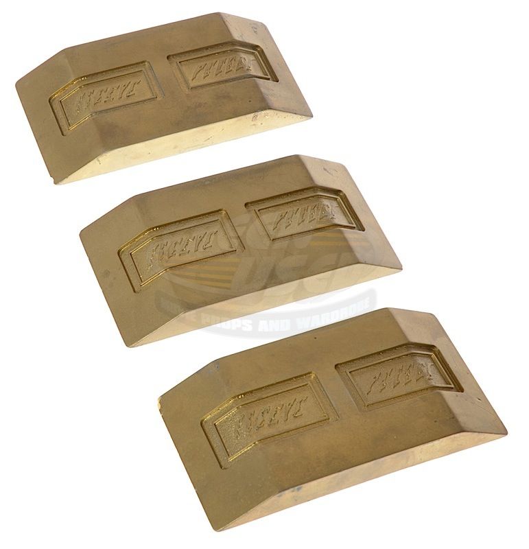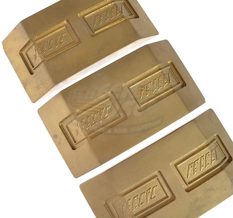 (Paramount-TV, 1993-99) This set of three Latinum bars were custom-made for use in various episodes of the show including "Who Mourns for Morn". Latinum is a rare liquid suspended within gold and is used as currency by the Ferengi as well as others. The bars are resin, painted gold, with raised Ferengi glyphs on them. Each bar measures approximately 8" x 4" x 1".
