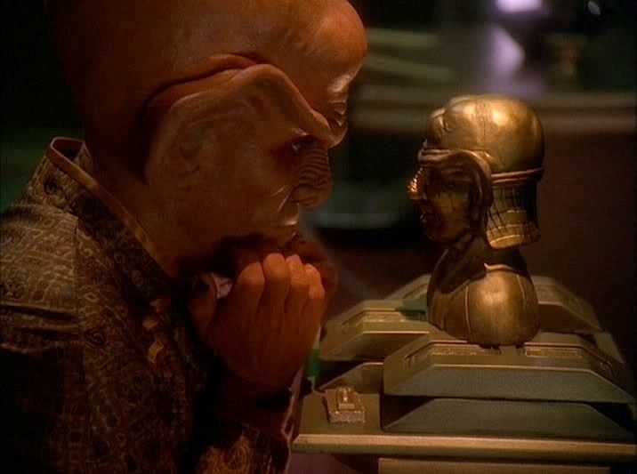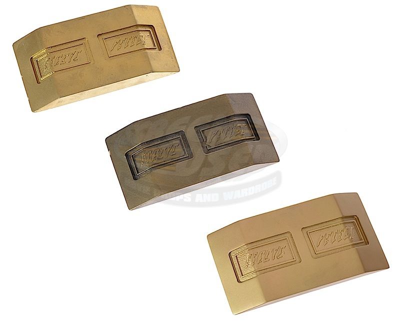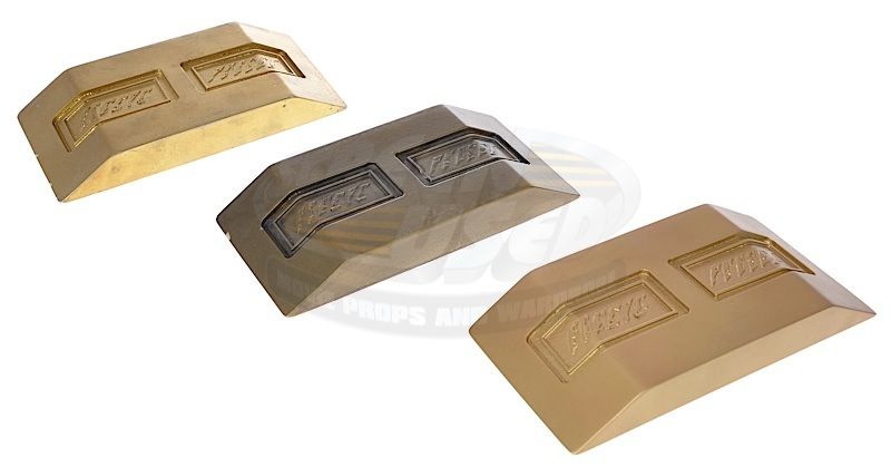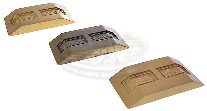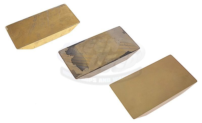 (Paramount-TV, 1993-99) This set of three Latinum bars were custom-made for use in various episodes of the show including "Who Mourns for Morn". Latinum is a rare liquid suspended within gold and is used as currency by the Ferengi as well as others. The bars are resin, painted gold, with raised Ferengi glyphs on them. Each bar measures approximately 8" x 4" x 1".