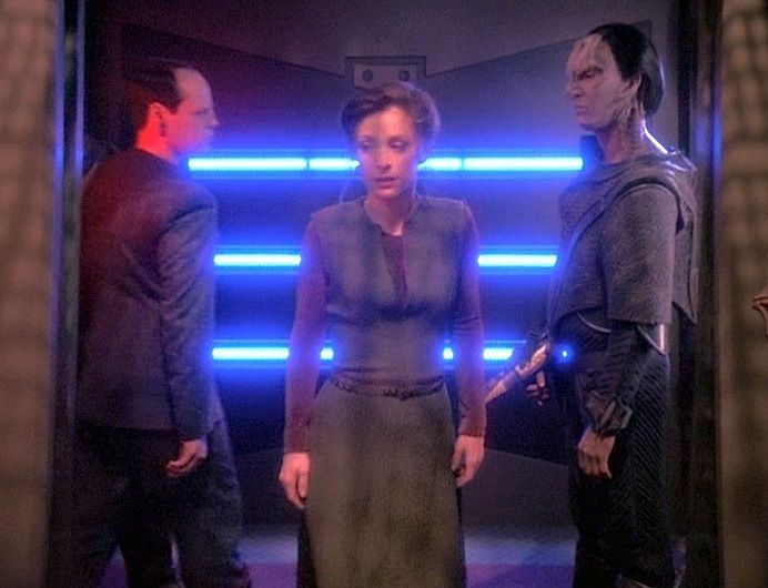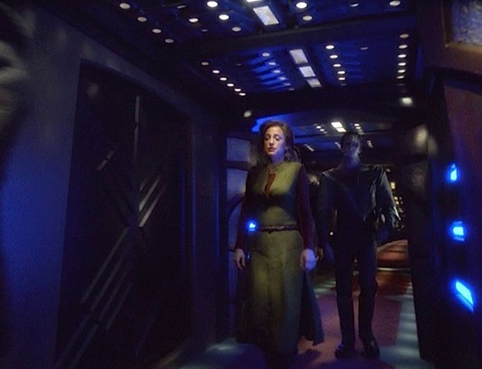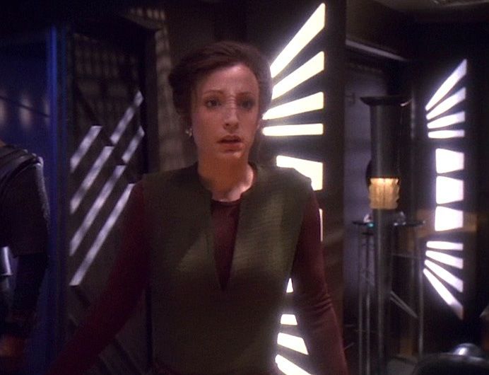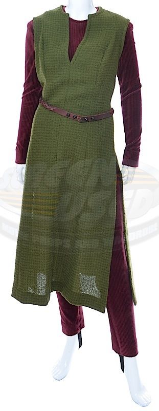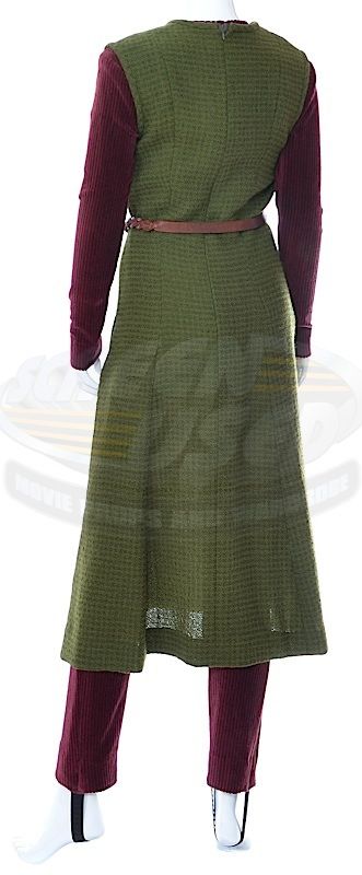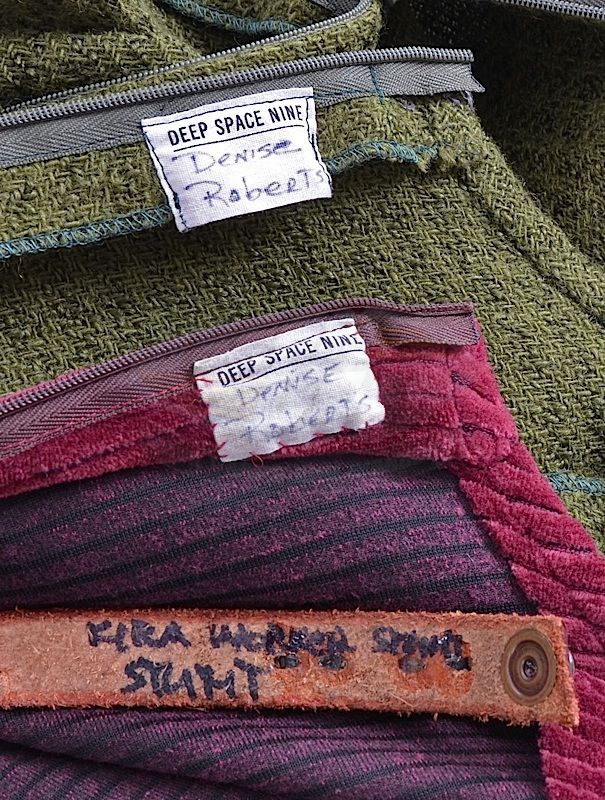 (Paramount-TV, 1993-99) This rust colored corduroy jumpsuit with green wool over dress and brown leather belt with black metal studs were worn by Nana Visitor's stunt double, Denise Roberts, while portraying "Kira" in various episodes of Star Trek: Deep Space Nine. Interior tags indicate wear by "Denise Roberts".