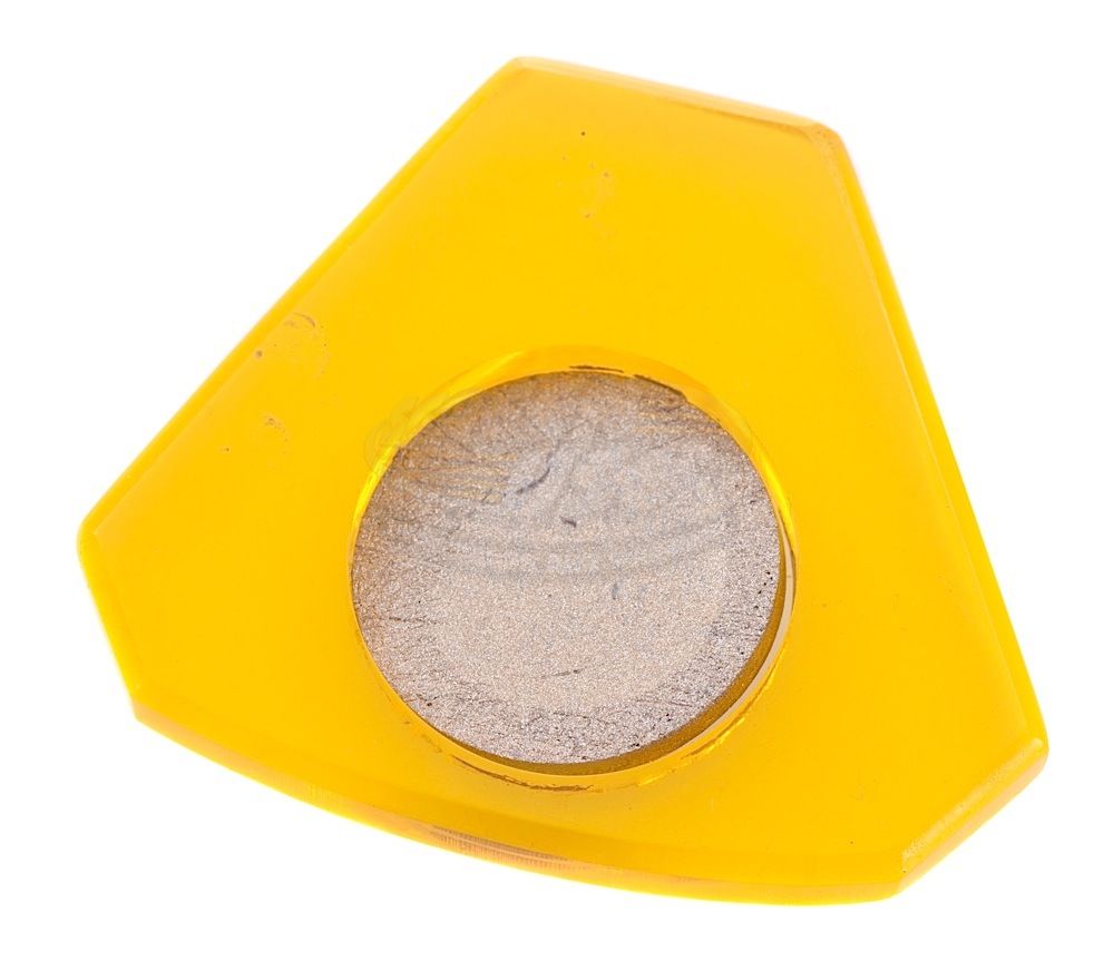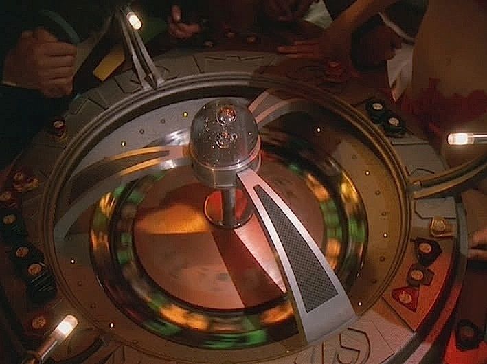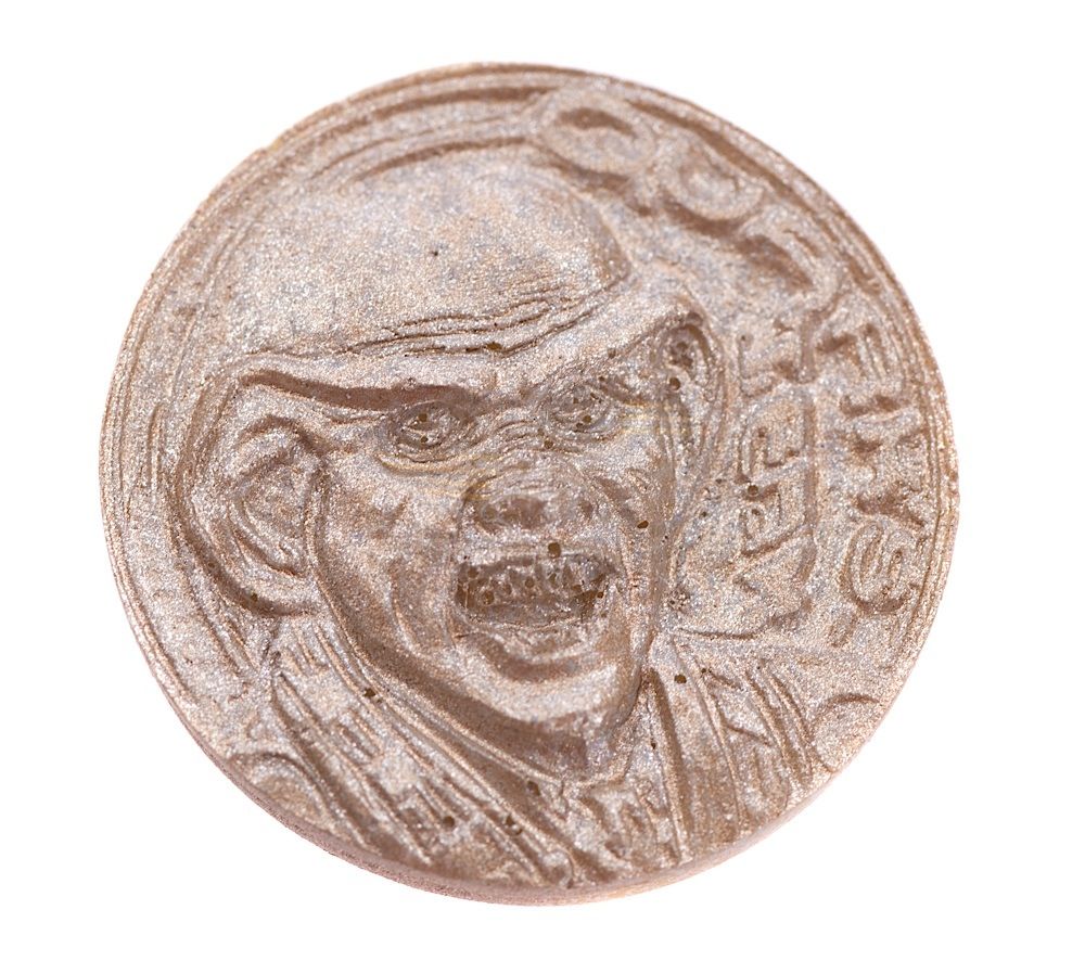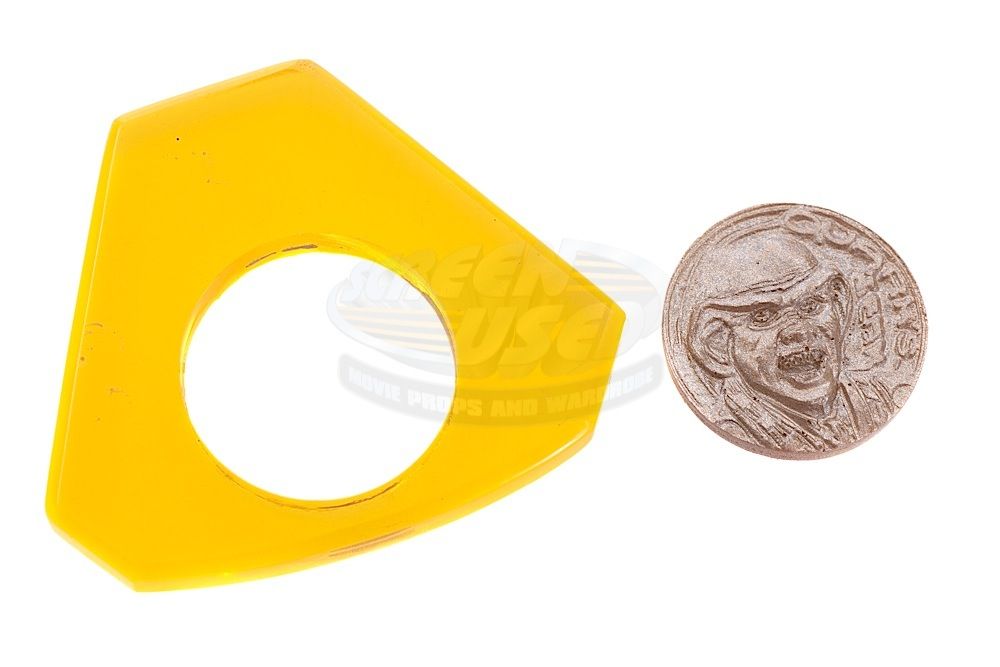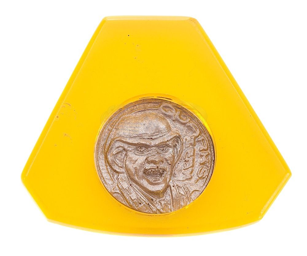 (Paramount-TV, 1993-99) This gambling token was used to play "Dabo" at "Quark's" (Armin Shimerman) bar in various episodes of Star Trek: Deep Space Nine. Made of yellow acrylic, with a metallic silver inset (loose from acrylic) etched with Quark's smiling face. Measures approximately 1.5" x 1.75".