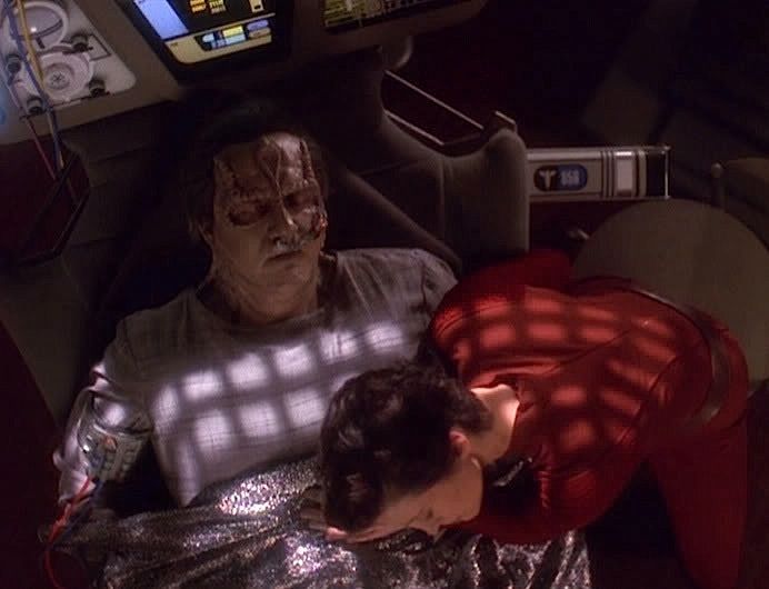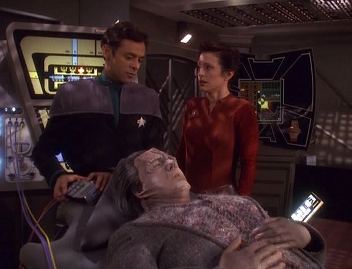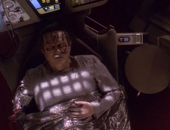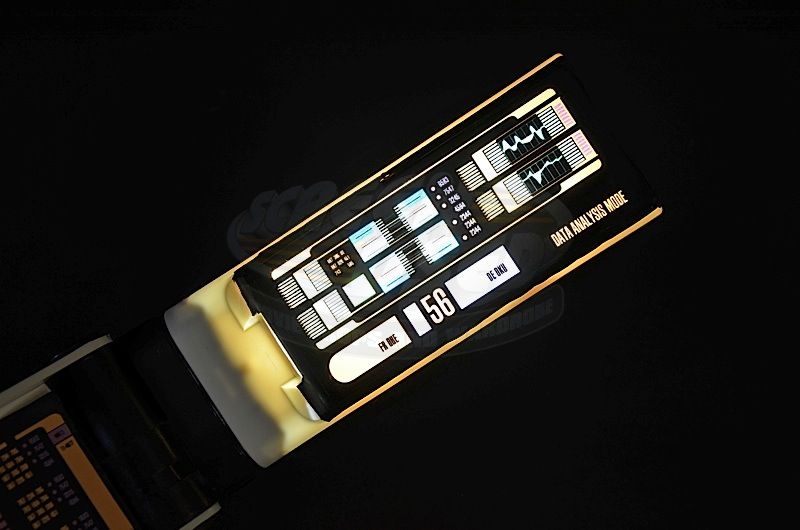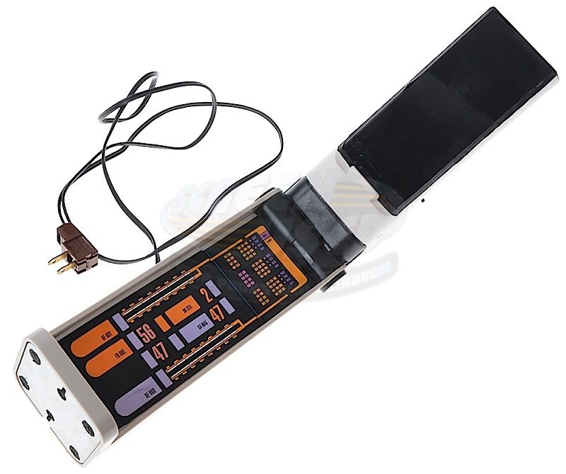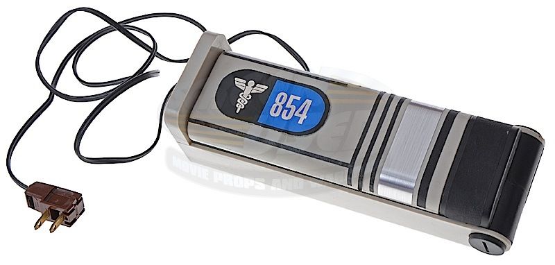 (Paramount-TV, 1993-99) This prop Starfleet medical device was acquired and customized by the production for use by various actors and as set dressing. The prop is made from an off the shelf lamp modified with Starfleet medical graphics and a back-lit panel mounted over the existing light. The prop opens to expose the back-lit panel that still lights up and is powered by a standard plug. The device measures 11" x 10.5" when open, minor wear from production use is present.