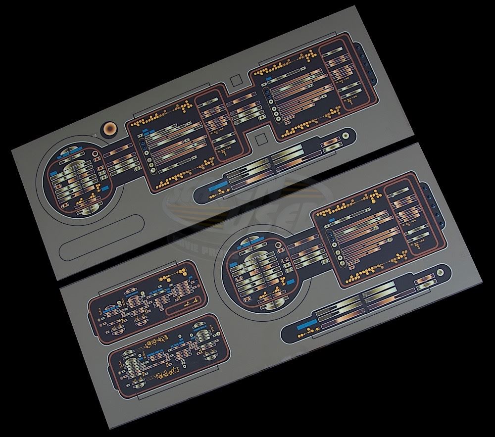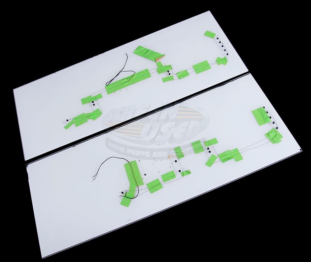 (Paramount Television, 2001-05) This pair of impressive electronic alien panels were custom-made by the production for use as set dressing during filming of Star Trek: Enterprise and can be seen in the episode titled "Cold Station 12". Each panel is made of clear acrylic with an olive green silk screen vinyl application on the front depicting faux controls. Each panel has a series of intermittently flashing blue LED lights that can be powered by a standard 9Volt battery although the wires are bare at the end and therefore a battery contact would be the easiest way to light the panels for long term use. Also attached to the panels are clear dome shaped rubber buttons. Each panel measures 41.75" x 16". In addition to our ScreenUsed COA, these panels come with an original "It's A Wrap!" COA.
