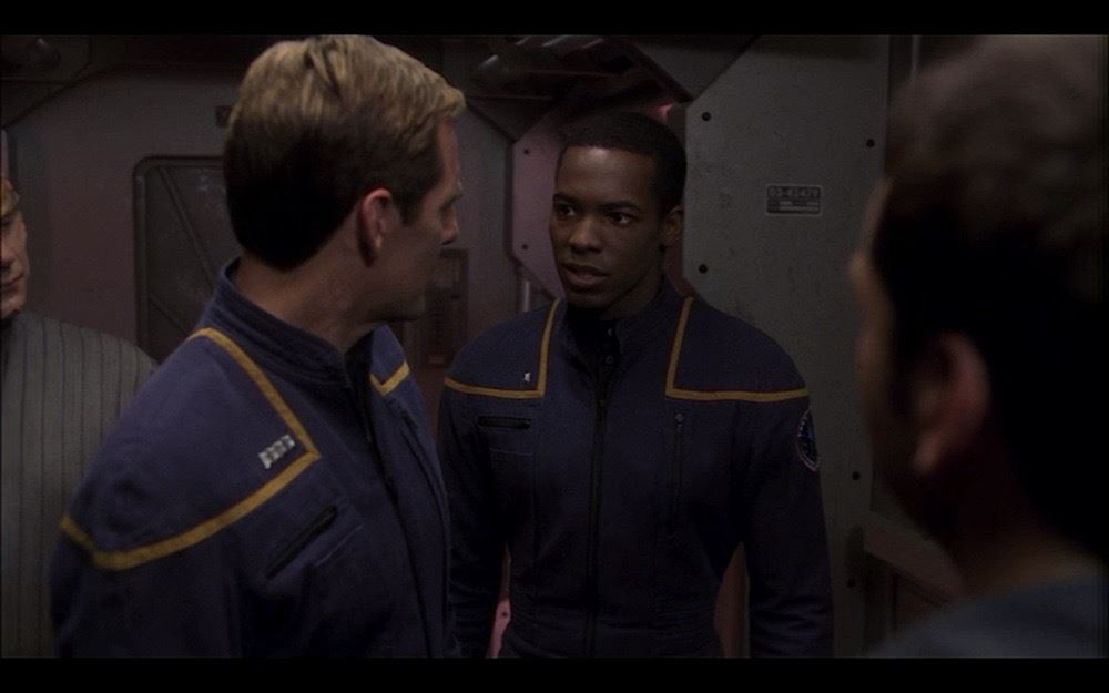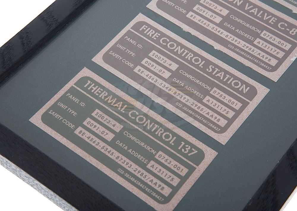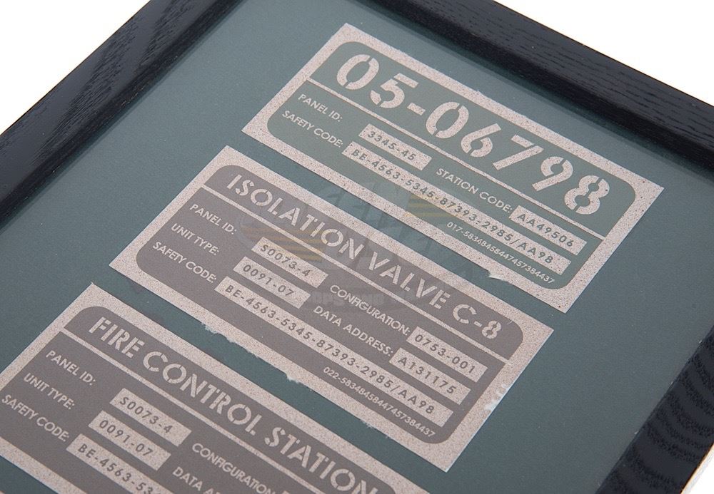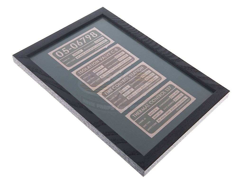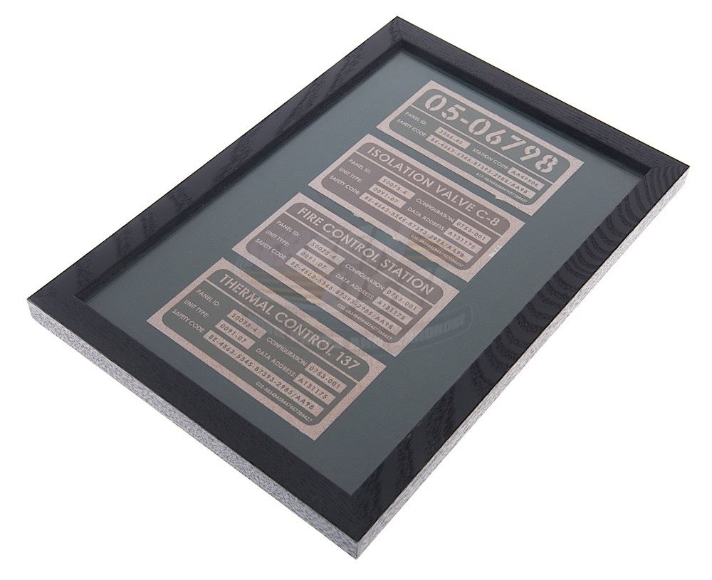 (Paramount Television, 2001-05) This set of four prop labels were custom-printed by the production for use as set dressing aboard the "ECS Fortunate" cargo ship. The labels feature the placement location and various information, each measures 4.75" x 2.5" and are framed for display. Frame measures 13" x 9".