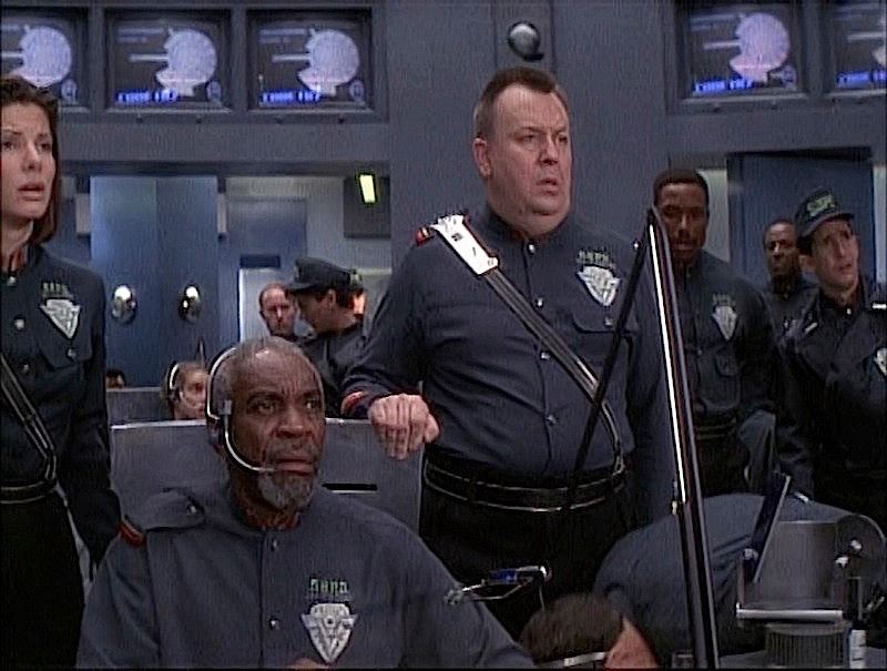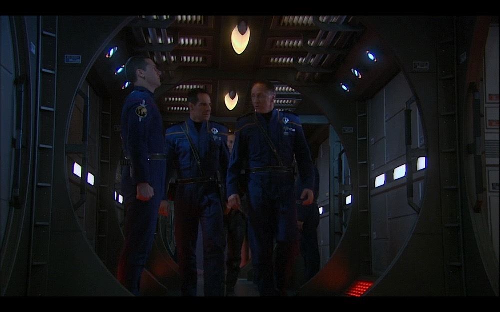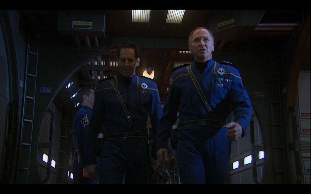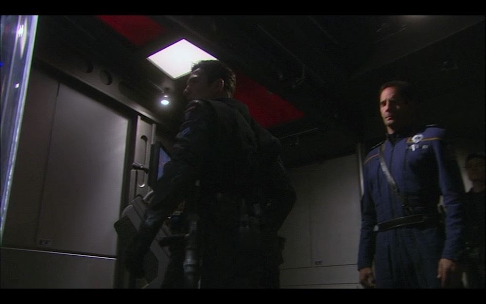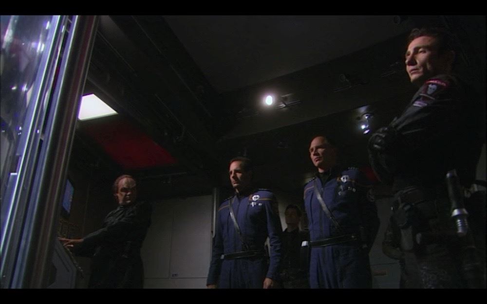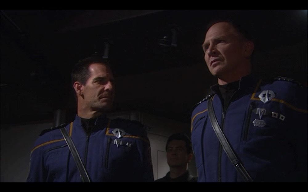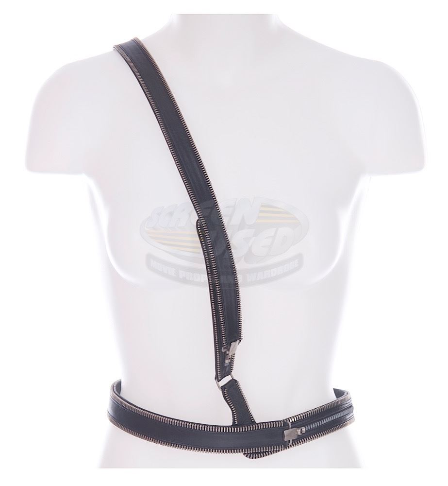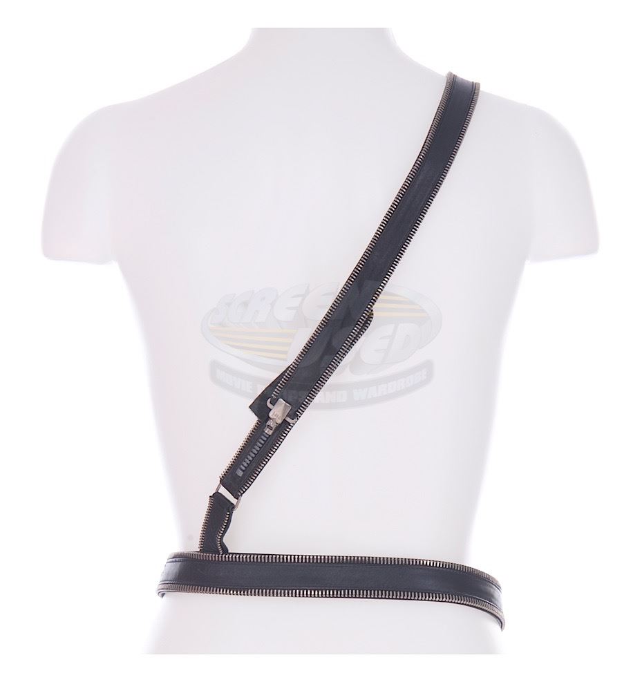 (Paramount Television, 2001-05) This belt was custom-made and used during filming of the film "Demolition Man" and reused by various actors as "Mirror Universe Starfleet Personal" in the season four episodes titled "In A Mirror, Darkly: Part 1 & Part 2". The leather belt features exposed half zippers along the edges and an attached shoulder strap. Markings on the reverse side still present from use in Demolition Man. Minor wear from use is present.
