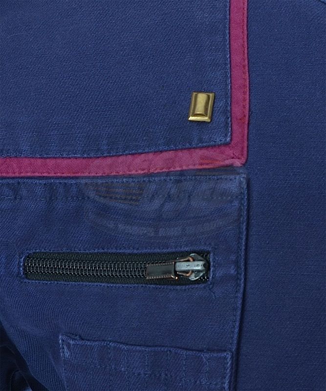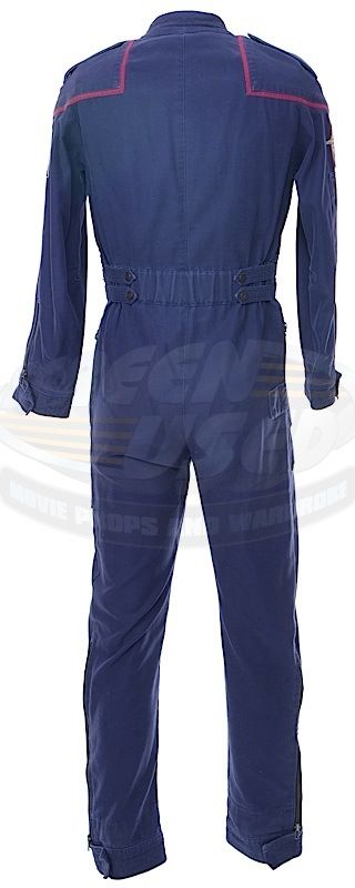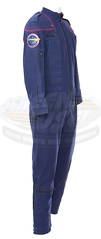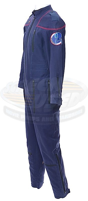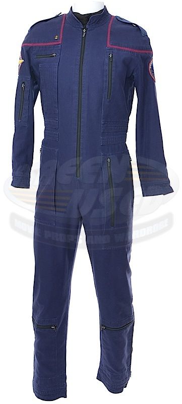 (Paramount Television, 2001-05) A Starfleet uniform jumpsuit made from the familiar blue material with multiple zippered pockets and zip/Velcro size adjustments at the cuffs and ankles. It has a form fitting elastic waist and engineering red division stripes around the shoulders. A couple of things make this visibly different from most ensign uniforms utilized throughout the series. While it has the famous "Enterprise NX-01" assignment patch on the left sleeve, a rarer patch is on the right sleeve. It features the motto "Ad Astra Per Aspera", which can be loosely translated as "Through hardship to the stars".