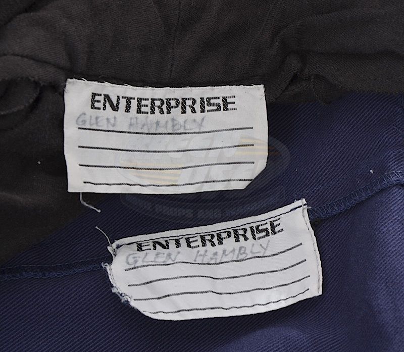 This uniform also has epaulets, two changes only seen in some uniforms in the final episode of Star Trek: Enterprise. This item was made for Glen Hambly, a Star Trek regular who appeared in a dozen episodes of Star Trek: Enterprise. It comes complete with a black button front long sleeve undershirt, both garments feature sewn in tags reading "Glen Hambly". Along with our ScreenUsed COA, this item comes with its original "It's A Wrap" COA.