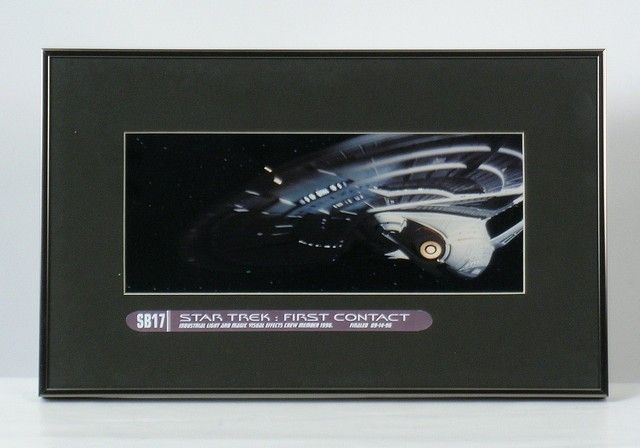 From "Star Trek: First Contact" (1996), the feature film version of "Star Trek: The Next Generation", this is a specially framed rendition of Captain Picard's Enterprise. It is beautifully framed with "SB17 - STAR TREK: FIRST CONTACT - INDUSTRIAL LIGHT AND MAGIC VISUAL EFFECTS CREW MEMBER 1996 - FINALED 09-14-96". Artwork is 13"x6" and specially matted frame is 18"x11.5".