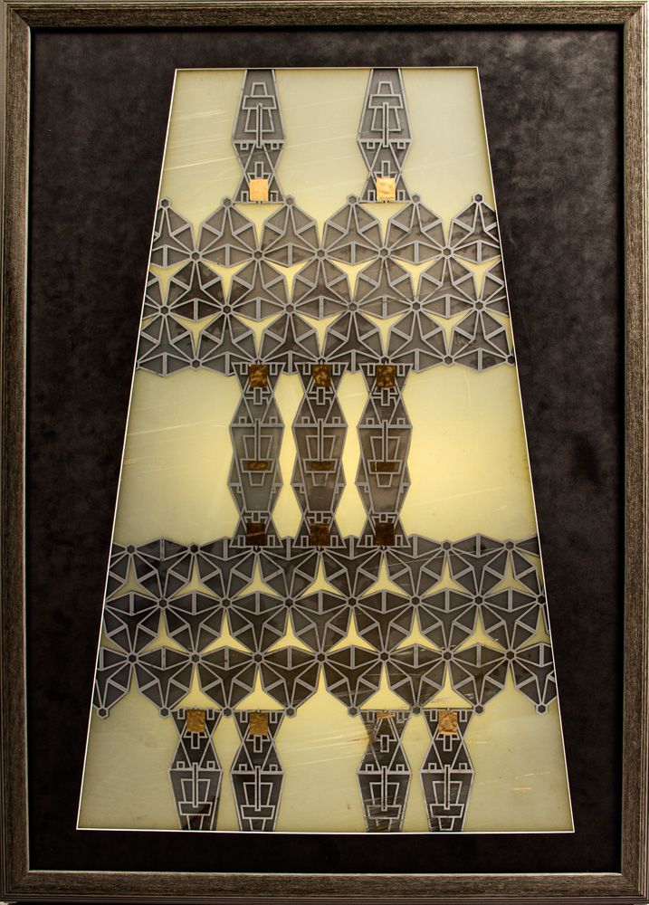 STAR TREK: FIRST CONTACT. (Paramount, 1996) Measuring 44 in. x 29 in. in size, this panel was created as part of the full scale Enterprise E Deflector Array set, which is seen in a memorable space battle between Picard and Worf against the Borg, who had modified the Deflector Array in an attempt to contact the Hive. The panel has been installed in a custom built light box that illuminates the panel. The light box measures 36 in. x 51 in. x 13 in. Light scuffing on the panel at the bottom. Otherwise, still in fine condition. This lot requires special shipping arrangements.