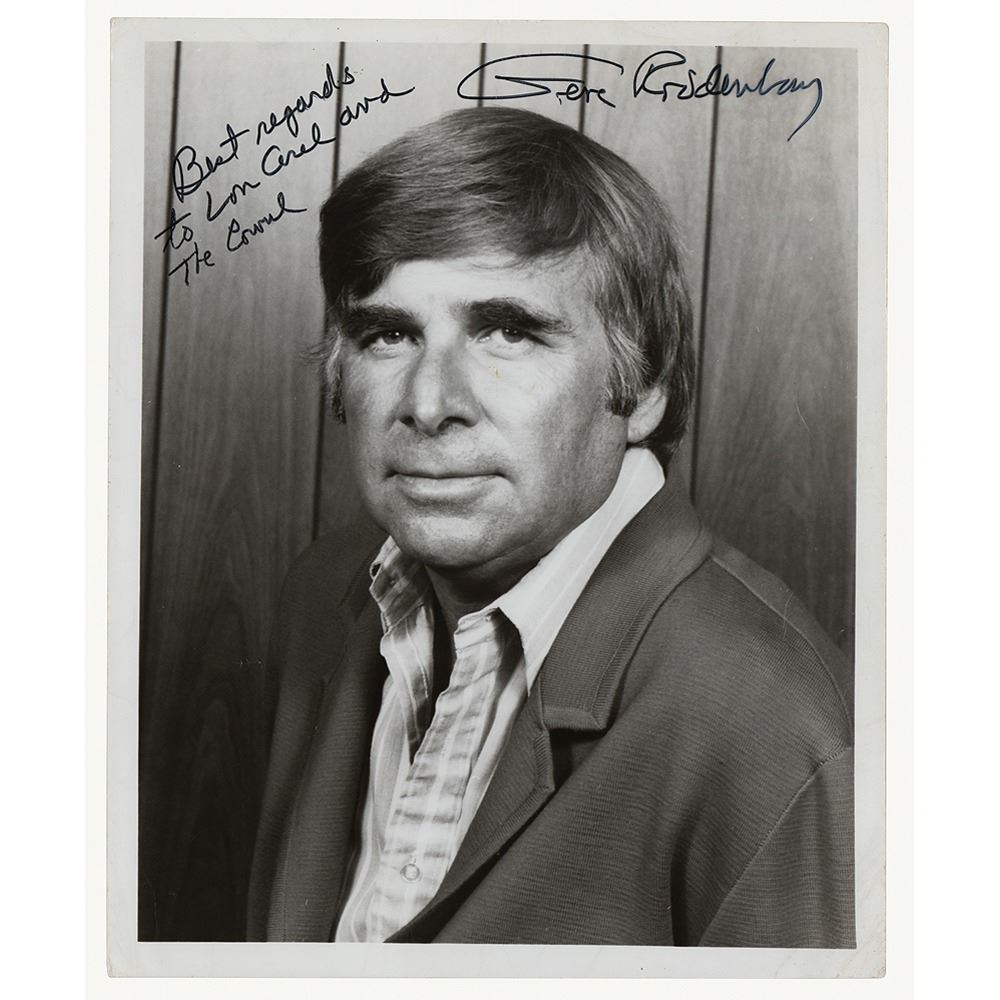 Glossy 8 x 10 photo of the Star Trek creator, signed and inscribed in black felt tip, "Best regards to Lon Cerel…Gene Roddenberry." In very good condition, with moderate overall surface creasing and crazing to the emulsion.
