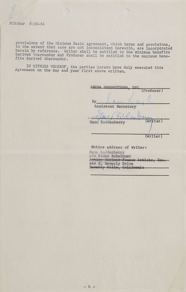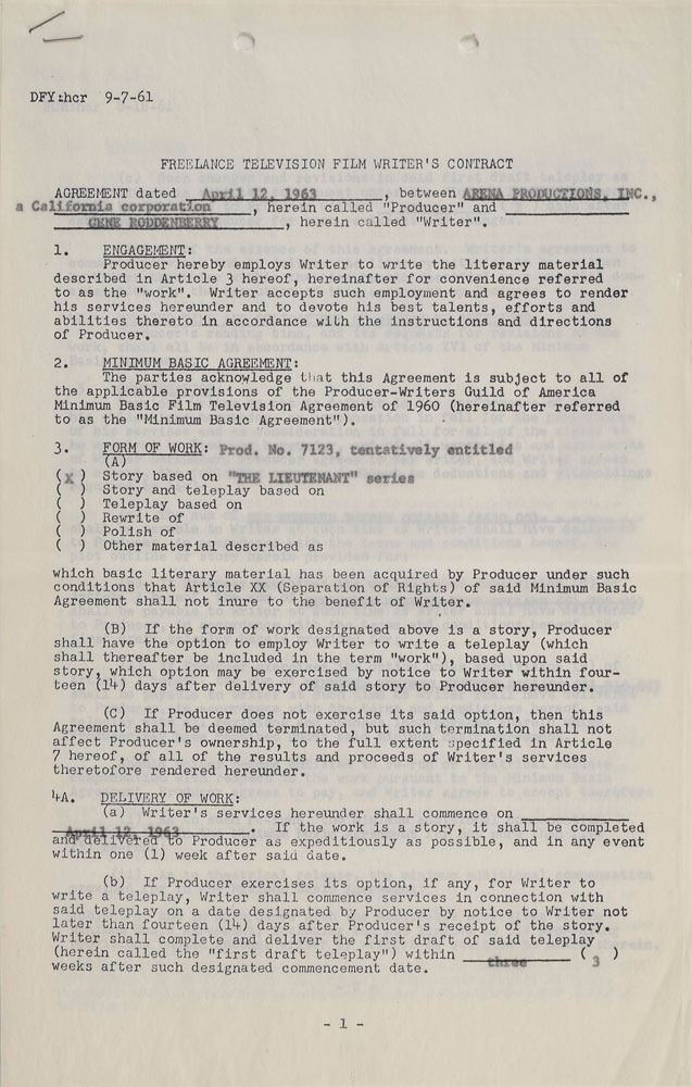 DS, six pages, 8.5 x 13, April 12, 1963. Freelance Television Film Writer's contract between Roddenberry and Arena Productions, Inc., in which the former "agrees to render his services hereunder and to devote his best talents, efforts and abilities" for a story "based on 'The Lieutenant' series." Neatly signed on the last page in blue ballpoint Roddenberry. In fine condition.